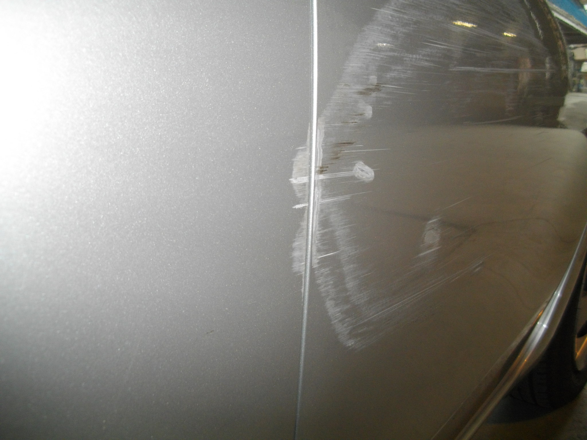 左フロントドアからリヤドア、さらにクォーターパネルにかけて、長く大きなへこみとキズがついてしまっていました。お客様からのご要望は「できる限り交換せず、費用を抑えてキレイに直したい」というもの。山幸の鈑金塗装技術で、部品代を最小限に抑えつつ、完璧な仕上がりを目指しました。