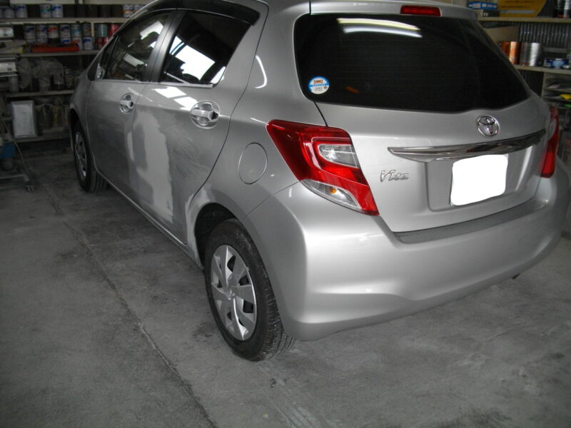 トヨタ・ヴィッツの左側面大修理。ドア2枚とクォーターパネルの広範囲なへこみを、交換ではなく鈑金と2K塗装で費用を抑えて復元。