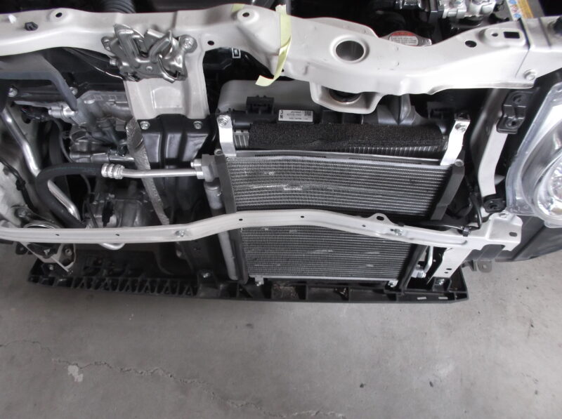 バンパーの奥にある「コンデンサー」は、エアコンを冷やすための大切な部品です。今回の事故ではここにも損傷が及んでいました。放置するとガス漏れの原因になるため、新品へ交換。目に見えない部分も妥協せず、機能面もしっかりリセットします。