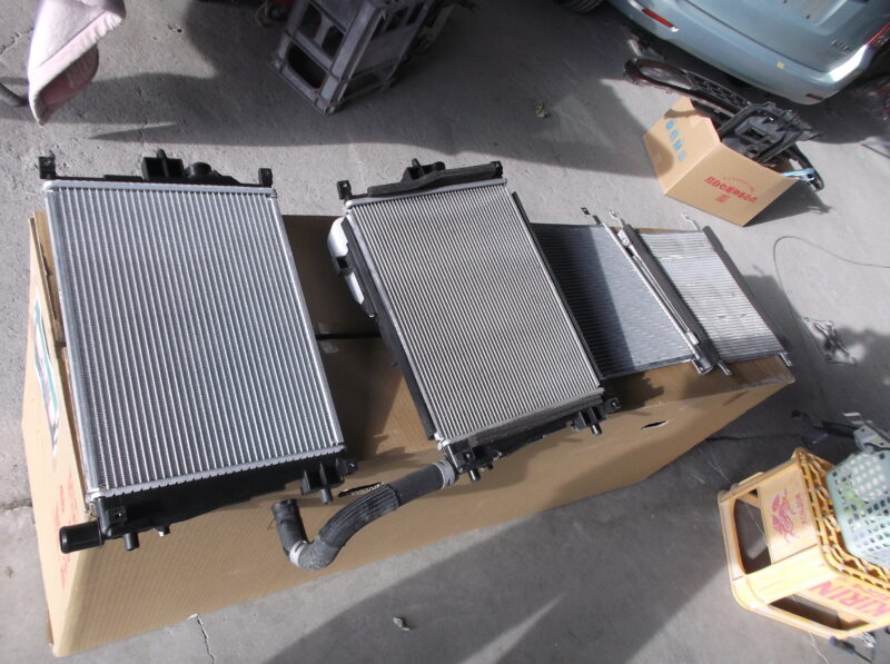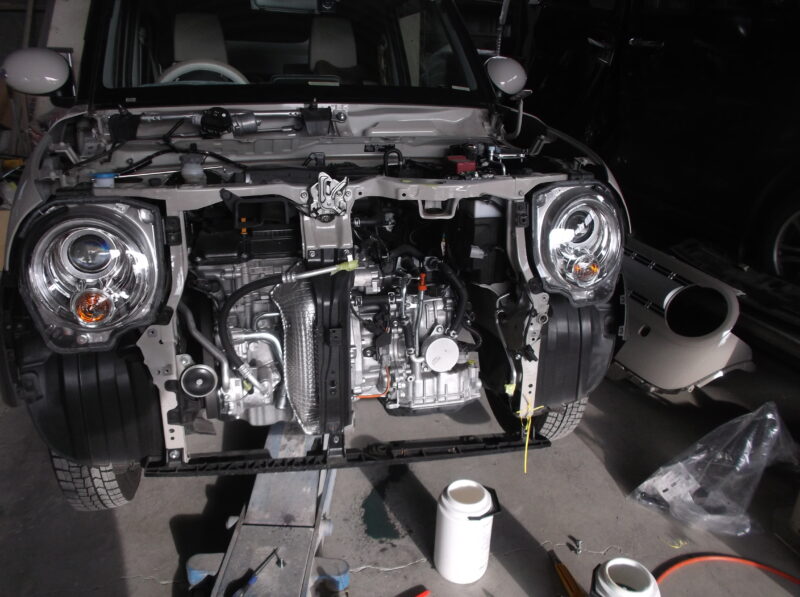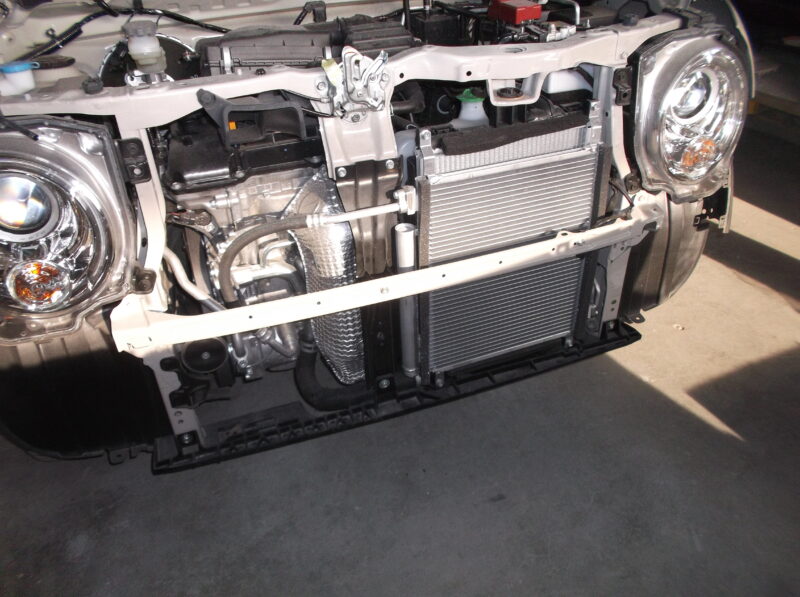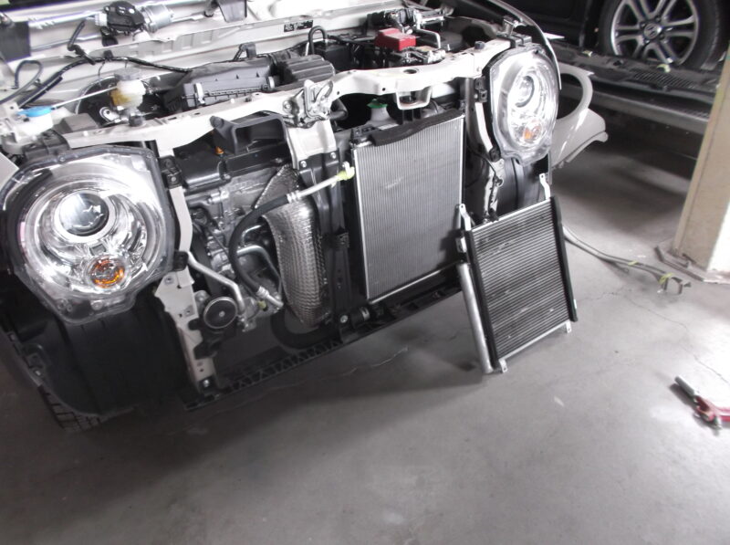 パンのフロント事故修理(保険適用)。ボンネット・バンパー交換に加え、内部のコンデンサーもリフレッシュ。