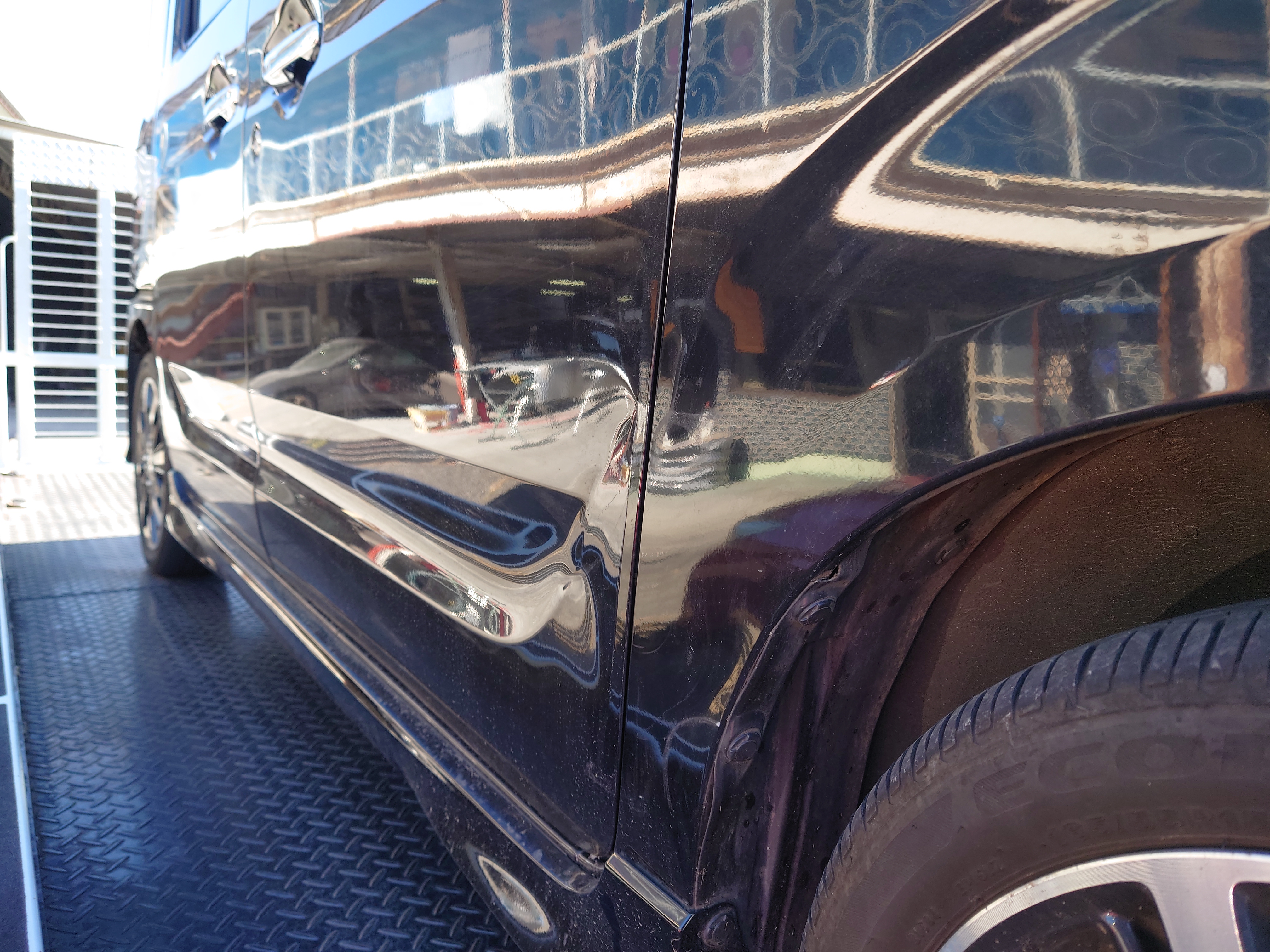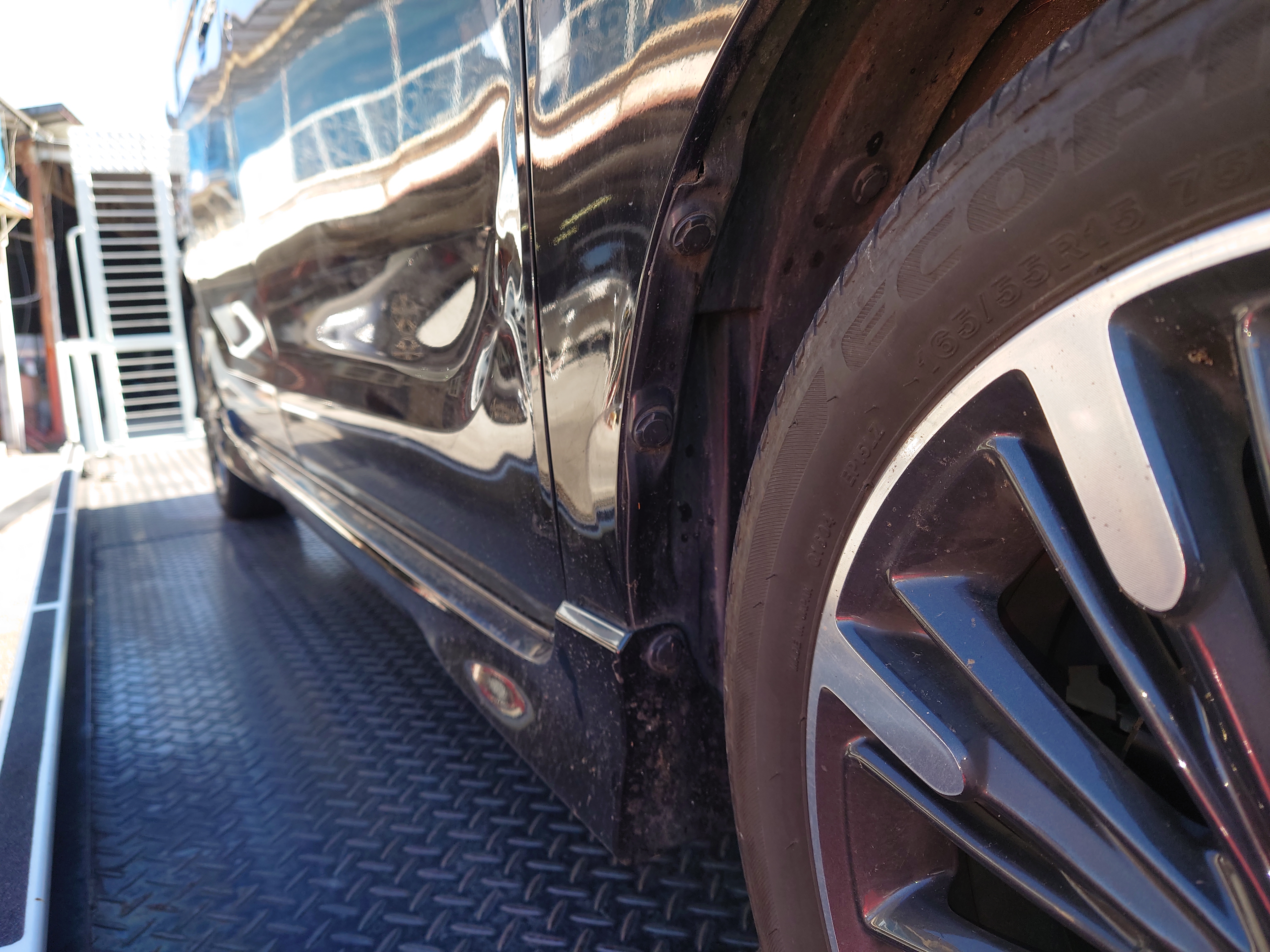 フェンダー部分のシャープなラインを復元します。パテに頼りすぎず、鉄板そのものを元の形へ導くことで、経年劣化に強い、強固な修理を実現します。