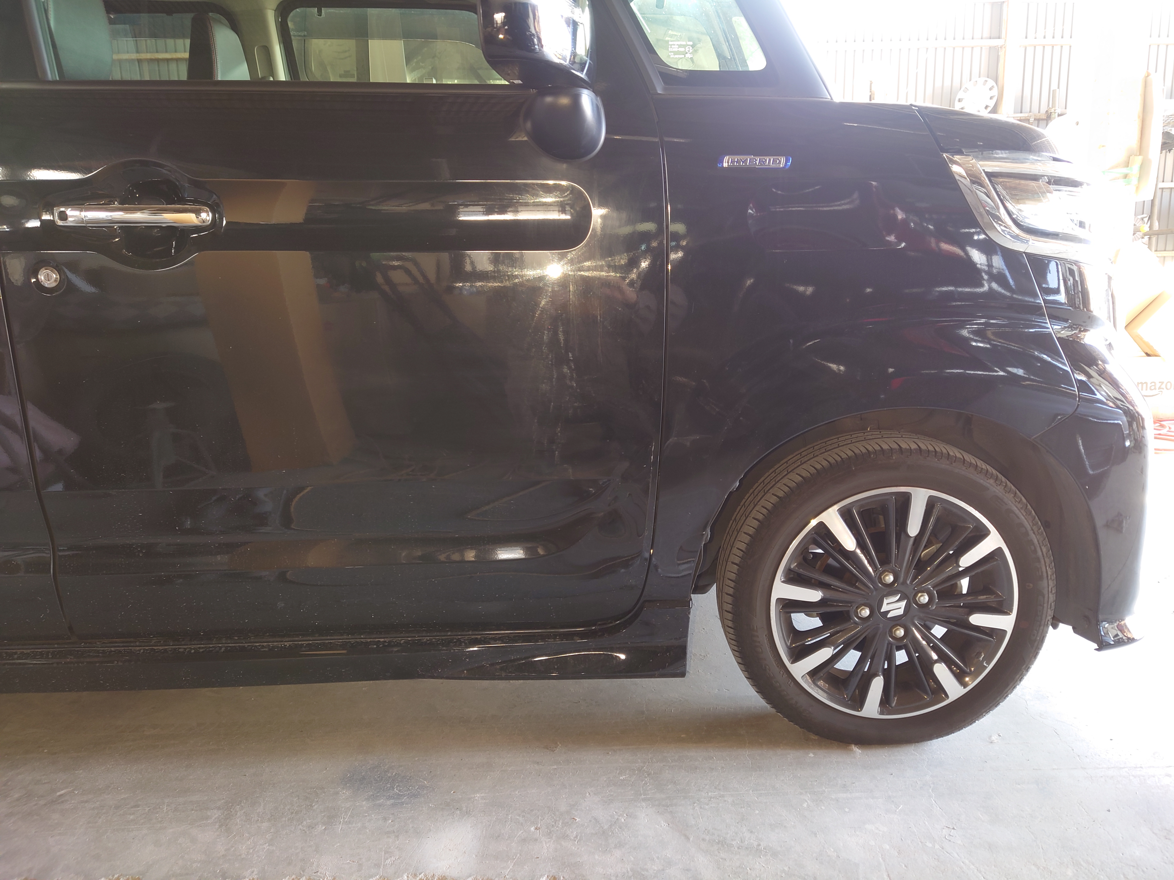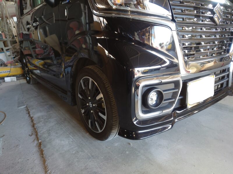 スペーシアのボディカラーに合わせて数グラム単位で調色。塗装ブース内でホコリを完全にシャットアウトし、新車時のツヤと質感を完璧に再現して吹き上げます。