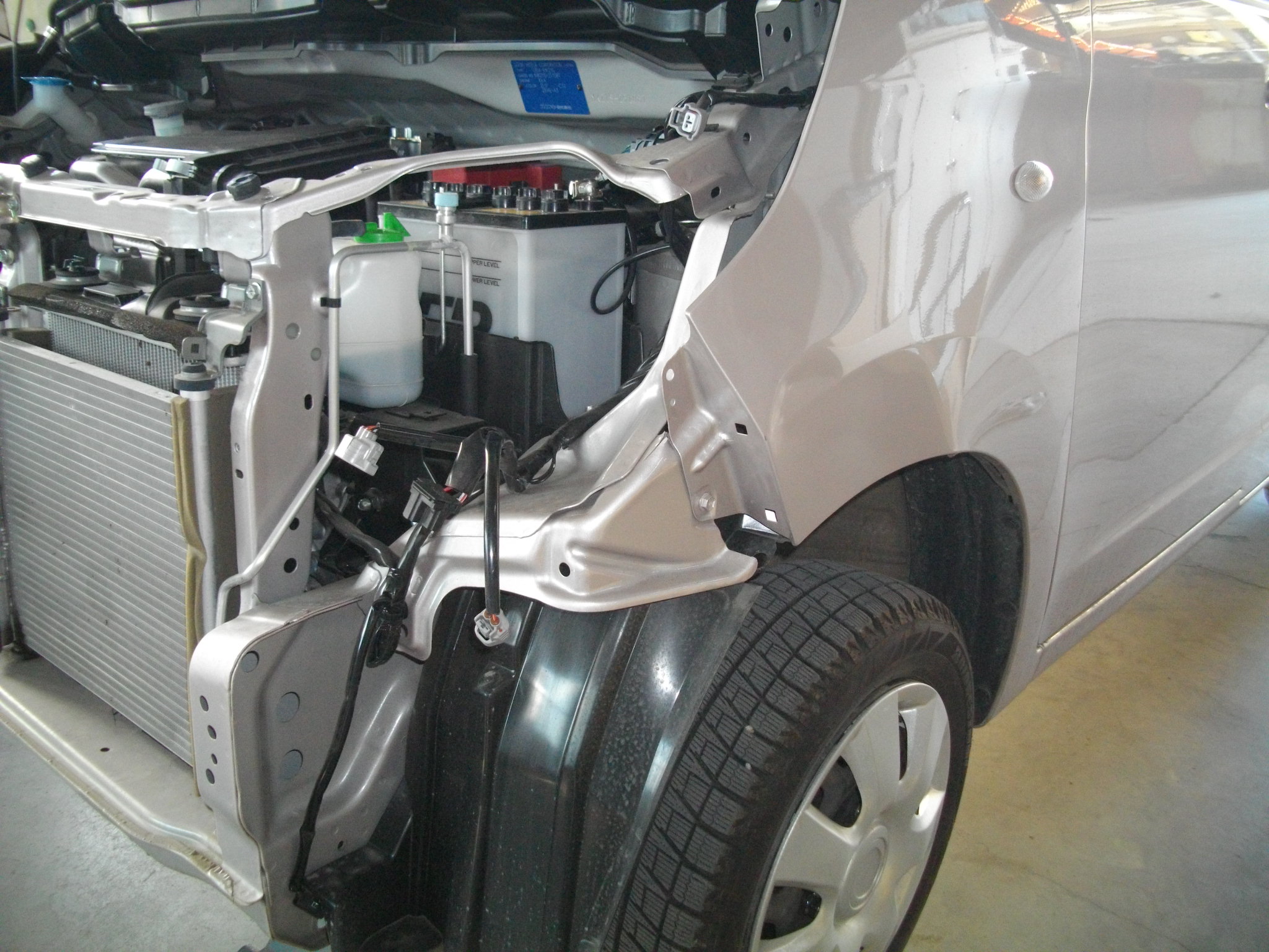 スズキ パレットの左フロント事故修理。バンパー・フェンダーの取替に加え、歪んだ内部骨格(エプロンパネル)を精密に修正し復元しました。
