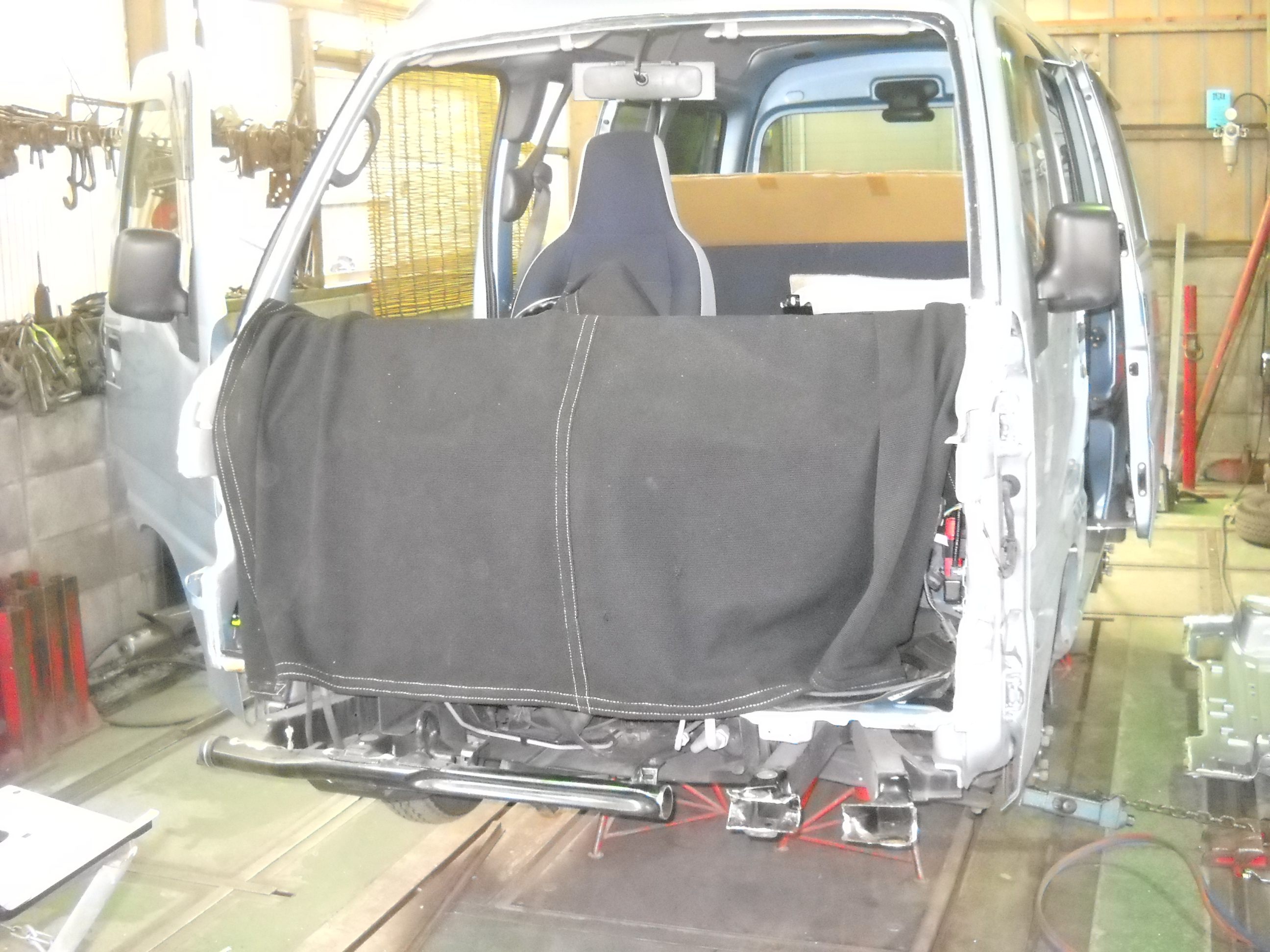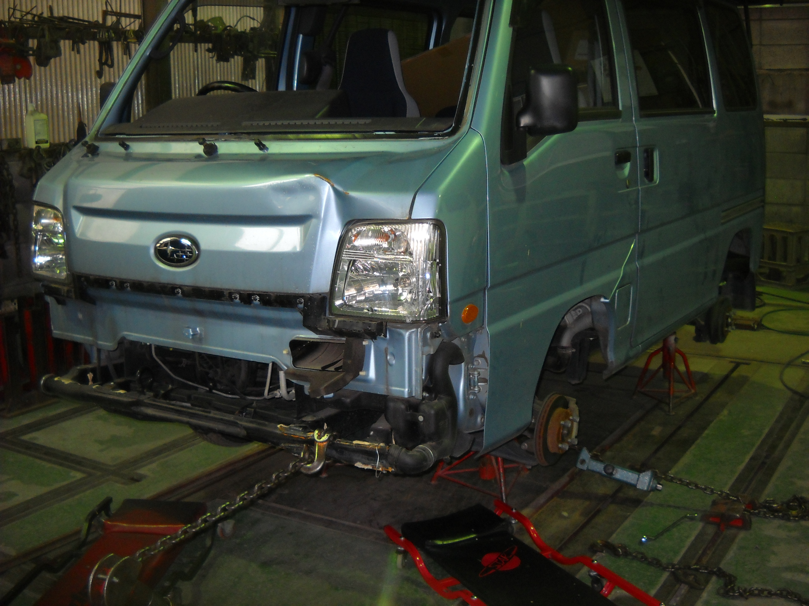 スバル サンバーの重補修。フロントパネルの全取替、ピラーの精密修正、フロントガラス脱着を実施。ナンバープレート再交付まで一貫対応しました。