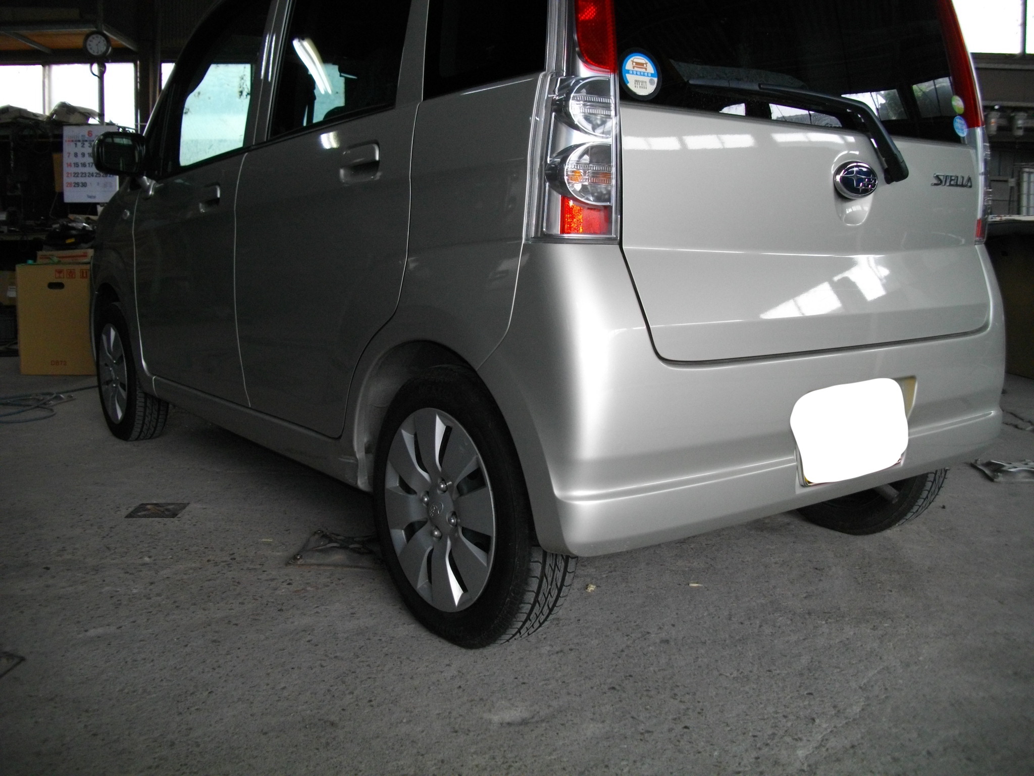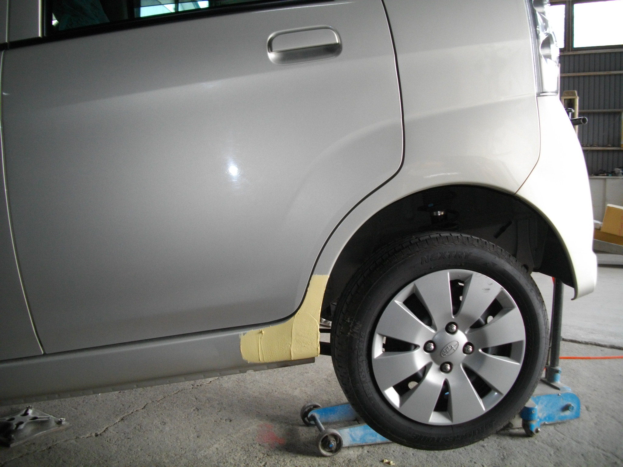スバル ステラの板金塗装|左クォーターパネルのキズ・へこみ修復。2K塗料でツヤとラインを再現