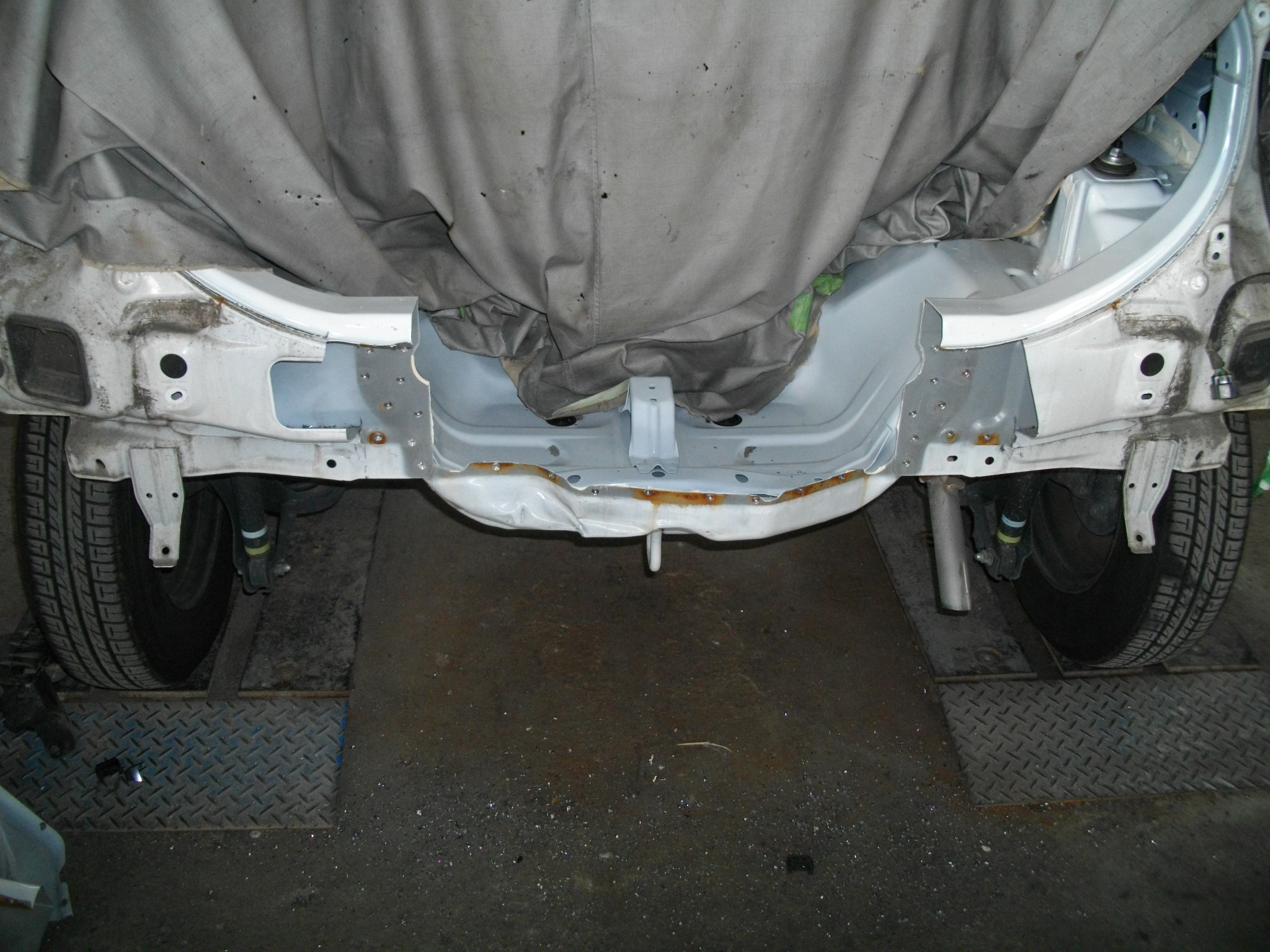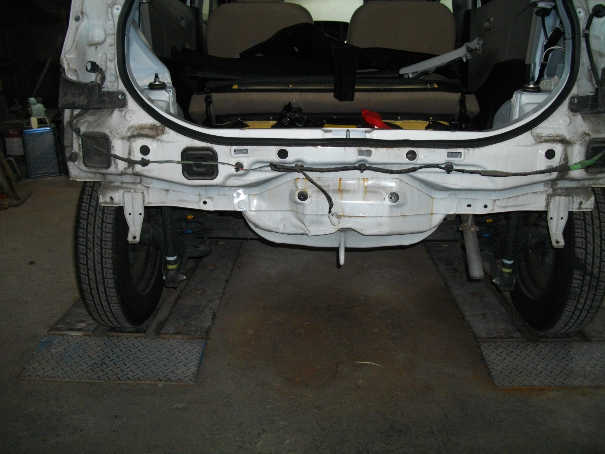 ダイハツ ミラのリア追突事故修理。バックドア・バンパー交換に加え、内部骨格であるバックパネル(インナー・アウター)を切断・溶接にて交換。ナンバー再発行も含め新車同様に復元しました。
