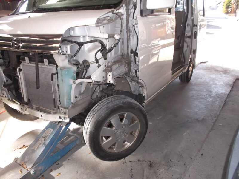 まずは目に見えるバンパーやフェンダーを取り外し、内部のダメージを慎重に点検します。一見、外側だけの損傷に見えても、アトレーのような軽バンは衝撃が骨格まで響きやすいもの。今回はライトを支えるラジエーターサポートや、足回りに近いエプロン部分にまで歪みが及んでいたため、修理の「設計図」を正確に引き直すことから始めました。