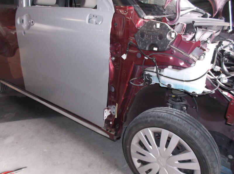 【ダイハツ キャスト修理】ドアとフェンダー交換、「ボディーピラー」の修正で復元|桐生市のお客様