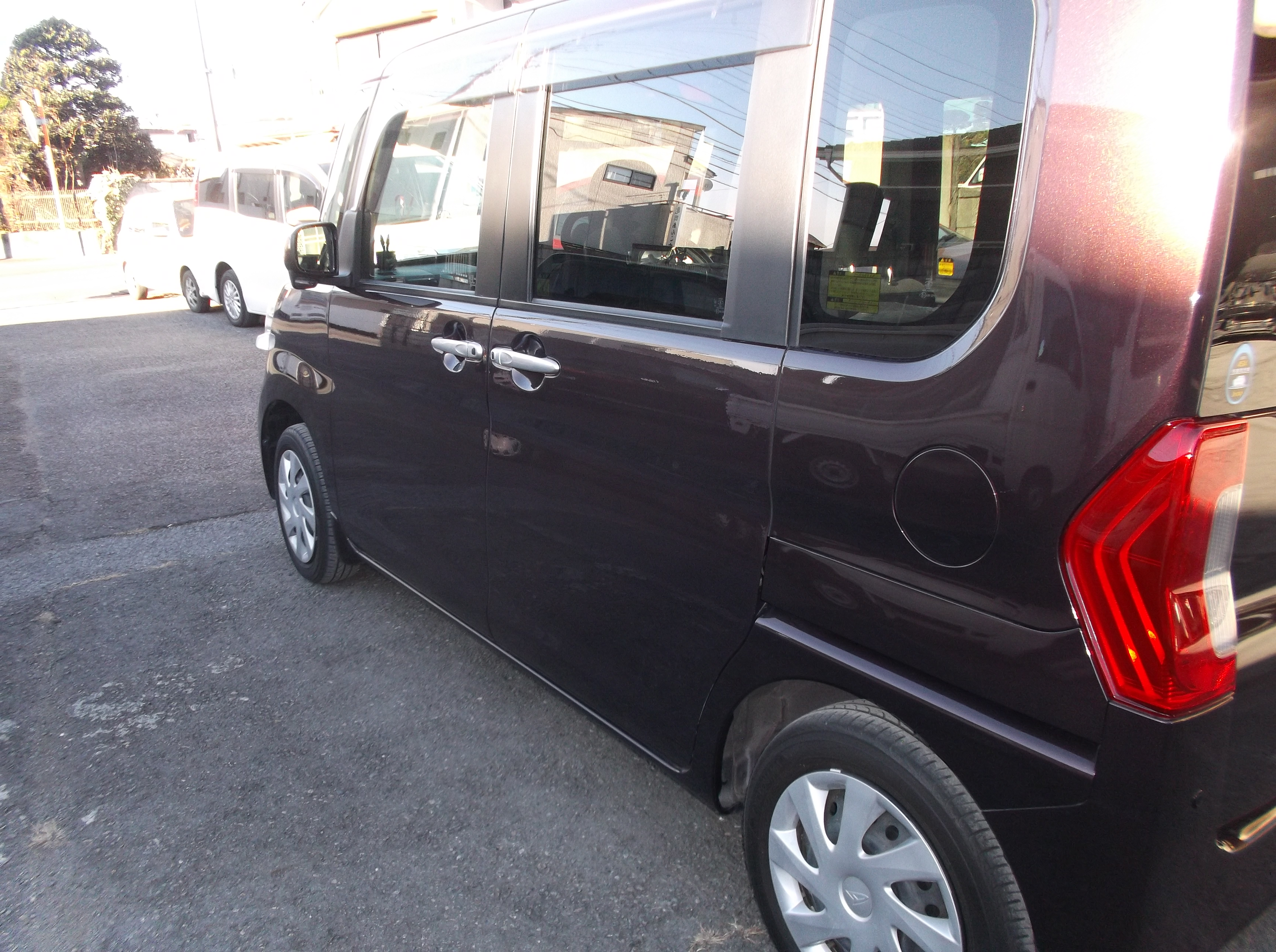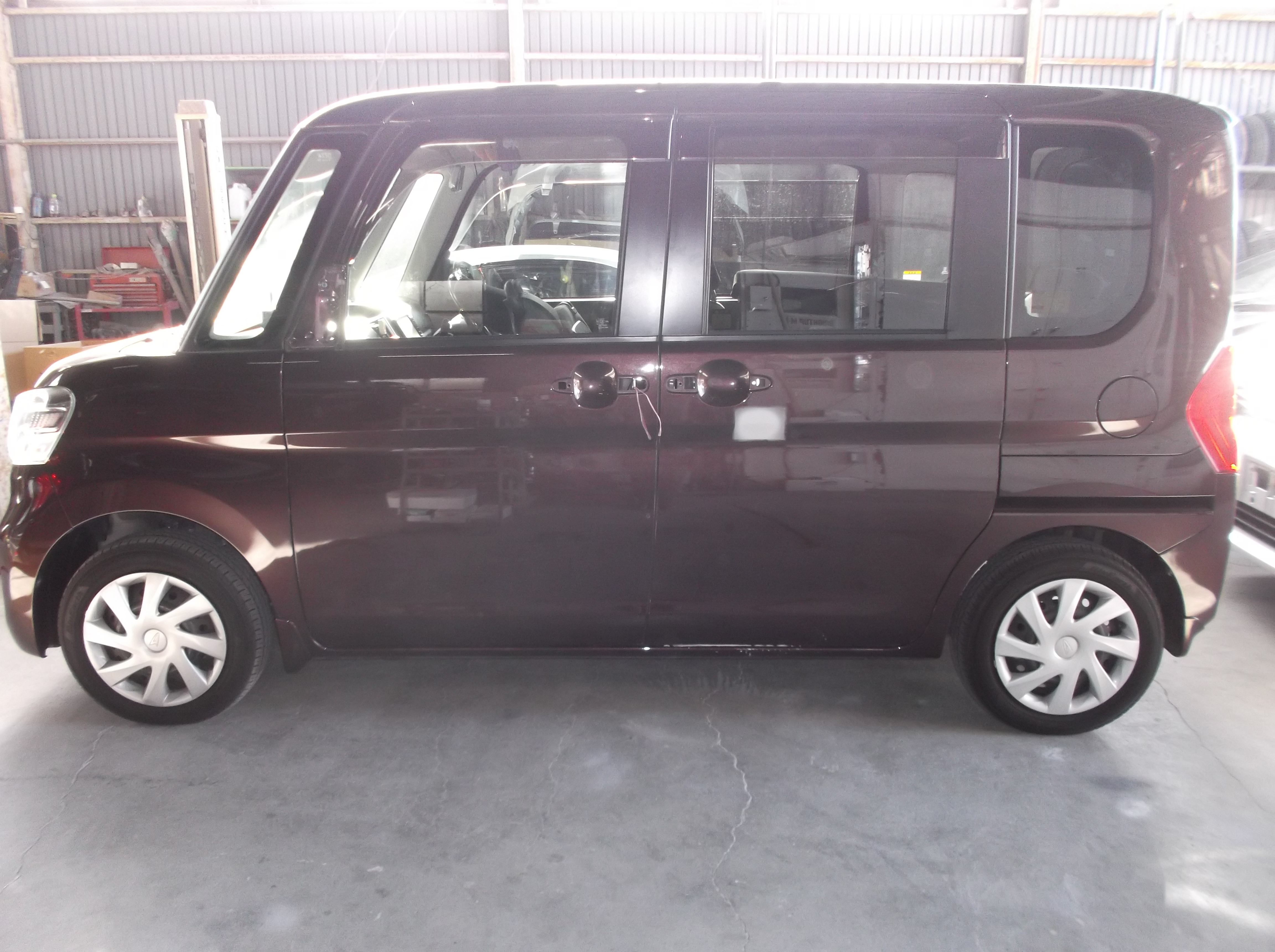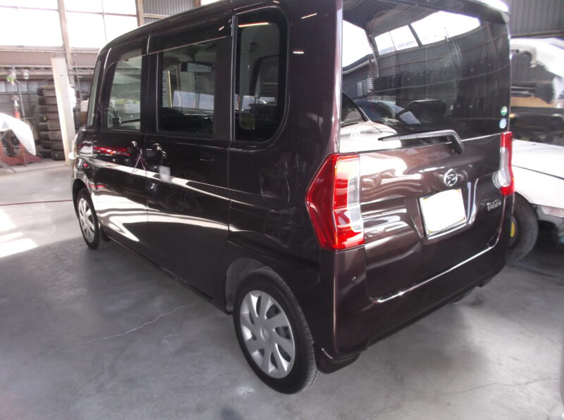 タントの左側面を板金修理|スライドドアの歪みも精密復元。2コートパールの高品質塗装とボディコート仕上げ