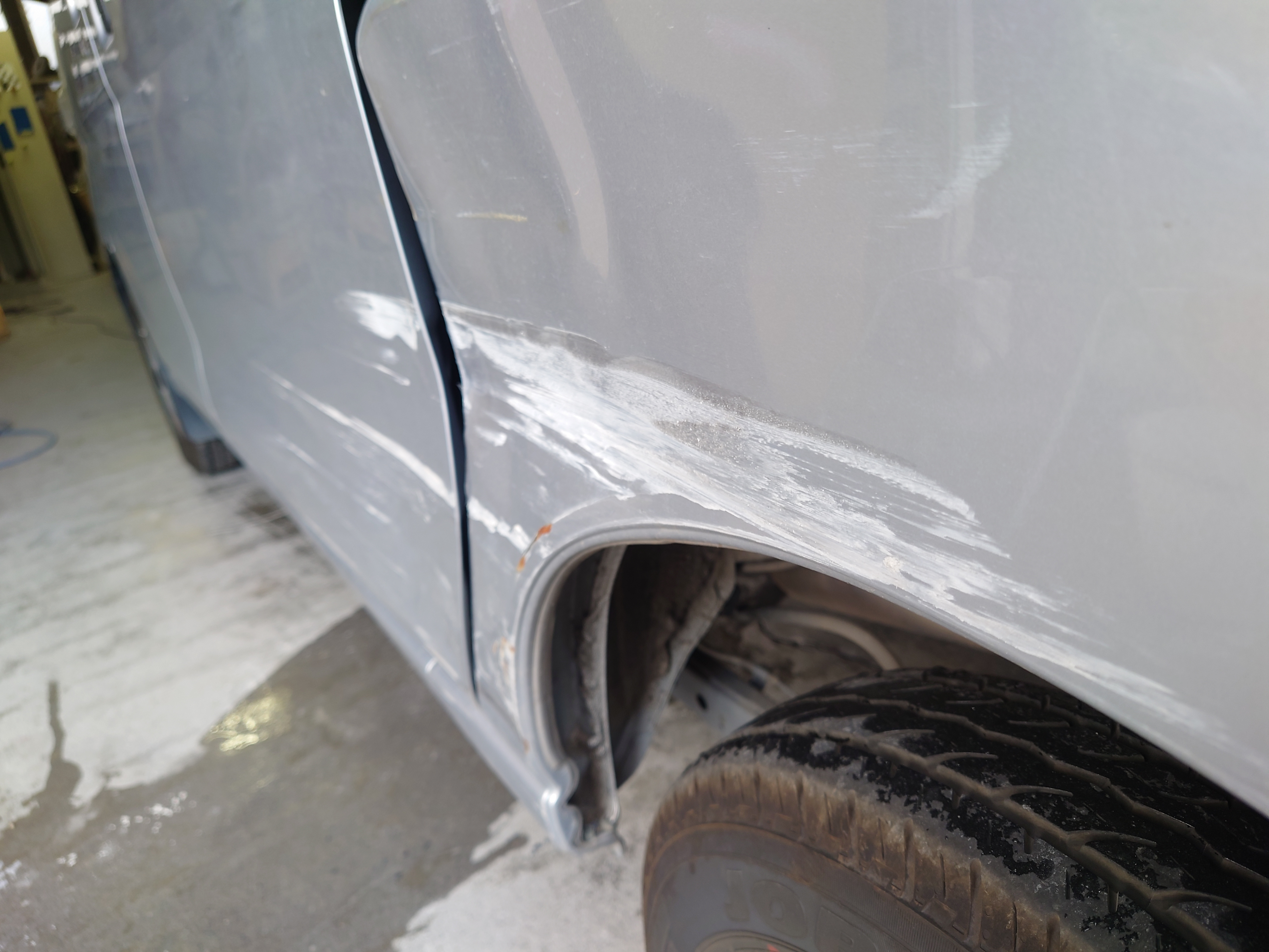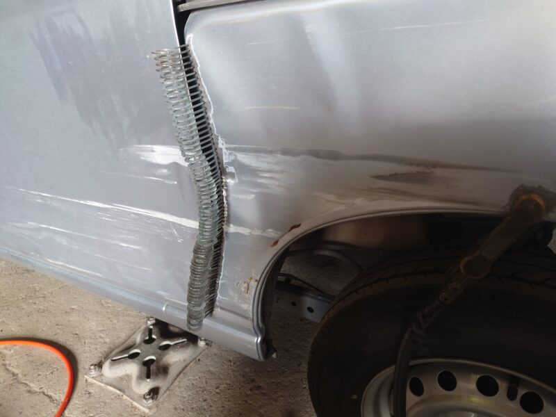 新品のドアを付ける前に、まずは受け皿となる車体側(フェンダー周辺)を直します。凹んだ鉄板をじわじわと元の位置まで引き出し、ドアがピタッと収まる「正しい空間」を再構築します。力任せに引っ張るのではなく、金属の反発を見極めながら形を整えていく、経験が問われる工程です。