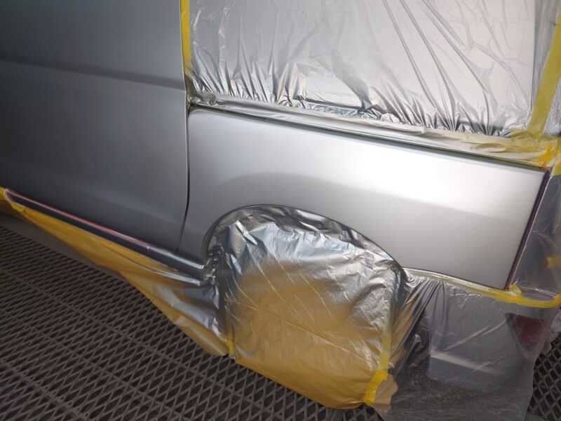 ダイハツ ハイゼットの左リアドア交換、フェンダー板金、クォータパネル修理。自社塗装ブース完備・商用車スピード対応・職人直営。伊勢崎市や太田市、みどり市で働く皆様の愛車を、創業40年の確かな技術で支え続けます。