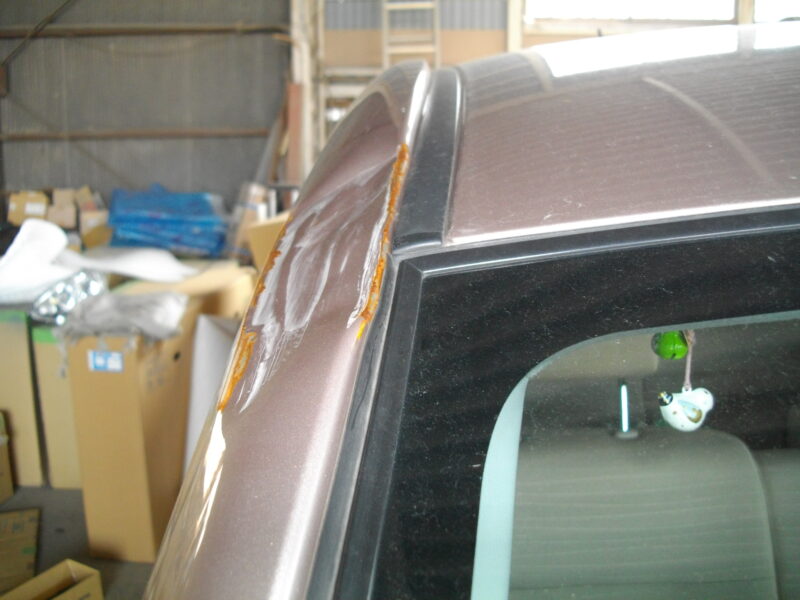 フロントピラーアッパーやクォーターパネルの凹みは、板金で丁寧に修正し、走行中の強度を確保。テールランプは交換して安全性を回復しました。