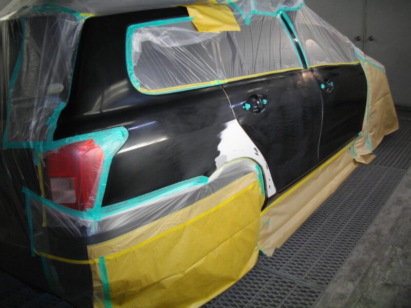 ここが一番の腕の見せ所です。新品ドアをしっかり塗るのはもちろん、板金したクォータパネル、さらに色味を馴染ませるためにフロントドアの端まで、霧のような細かい塗料を段階的に吹き付けていきます。この「ボカシ」という技術を使うことで、どこからが新しい塗装なのか、プロが見ても分からない自然なグラデーションが生まれます。