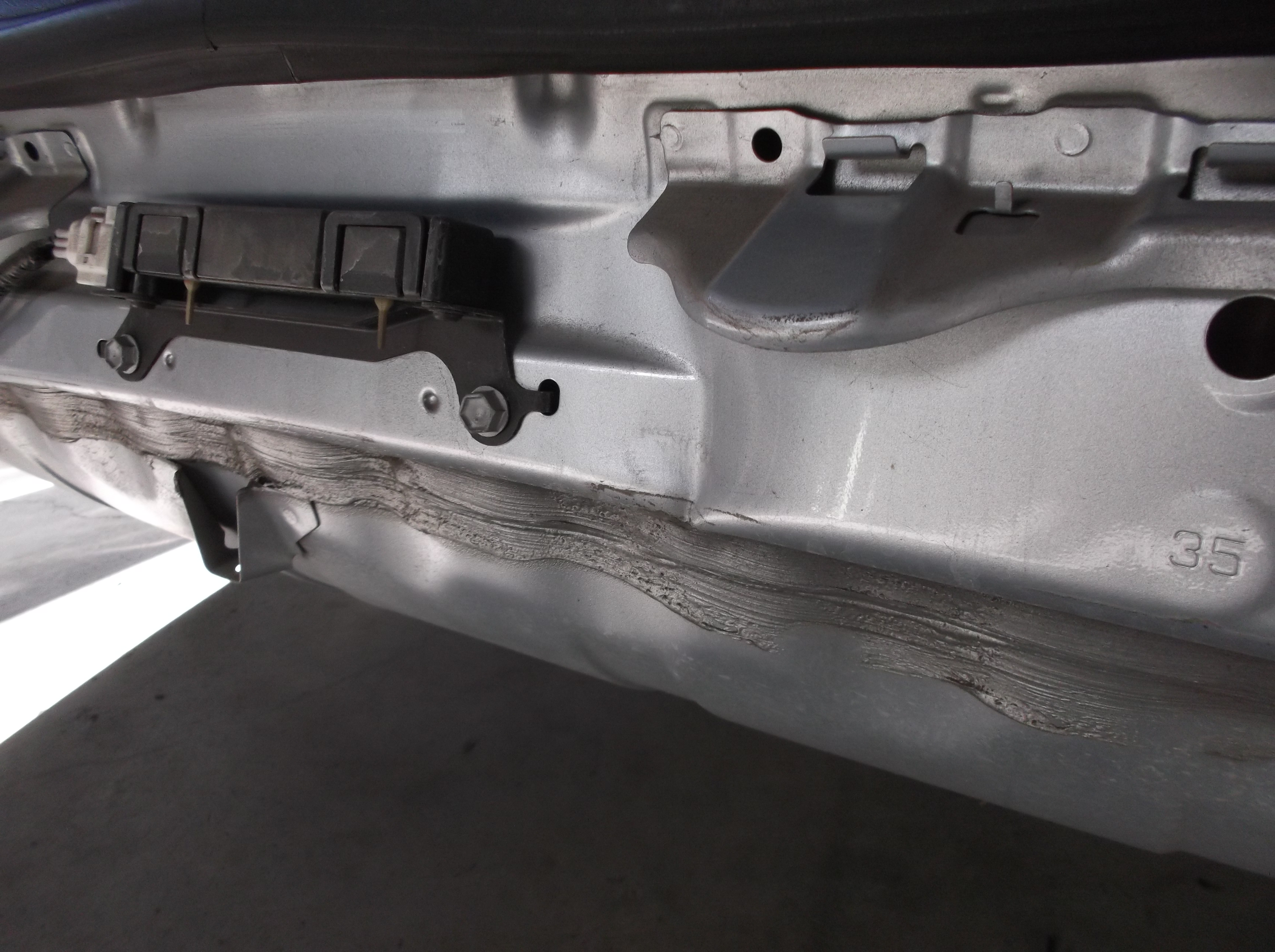 伊勢崎市のお客様より、リヤ追突事故に遭われたトヨタ ノアのご依頼です。バックドアが大きく大破し、一見外装だけのダメージに見えますが、内部のフロアパン(荷室の底板)まで歪みが及んでいる非常に深刻な状態でした。