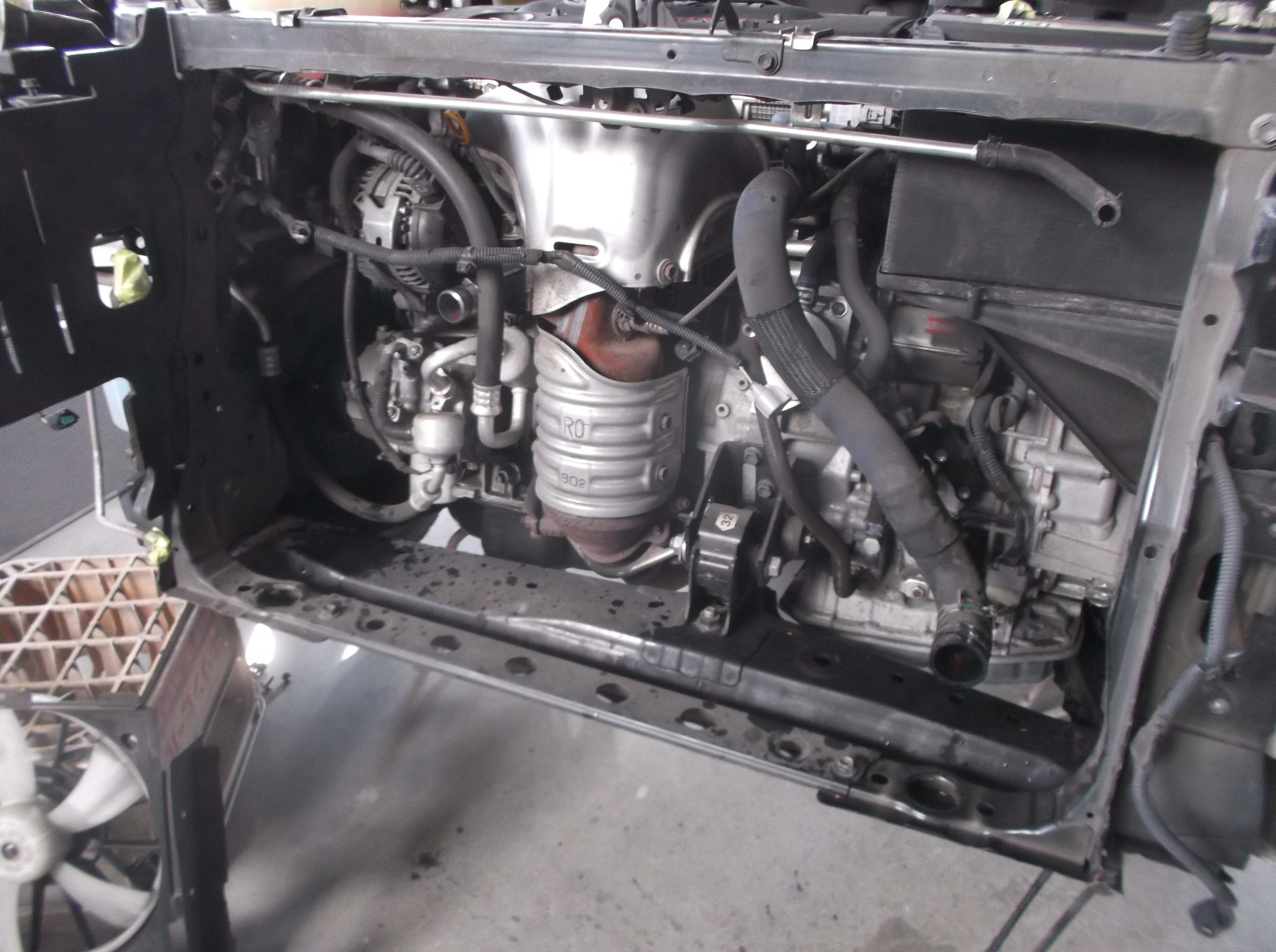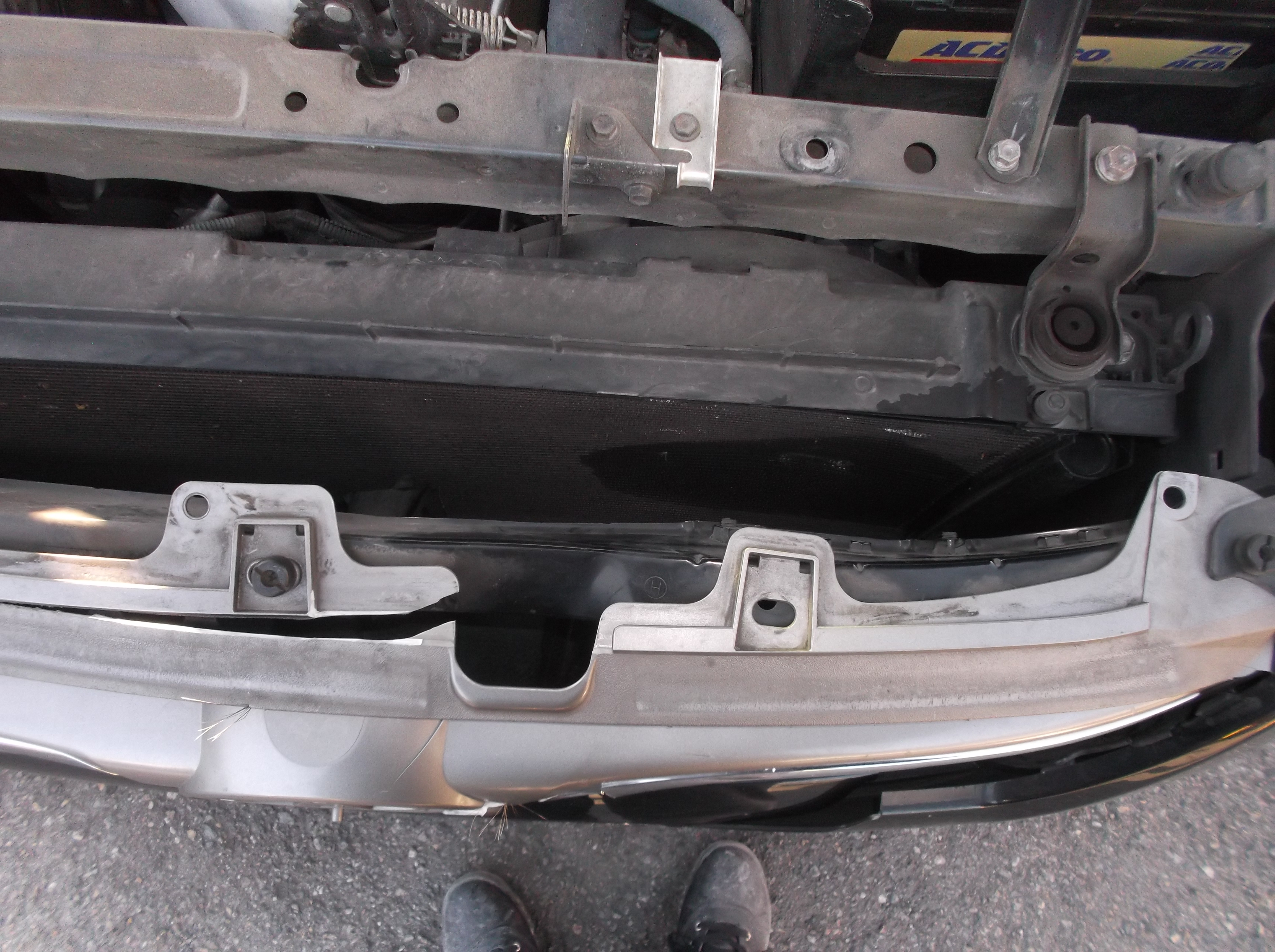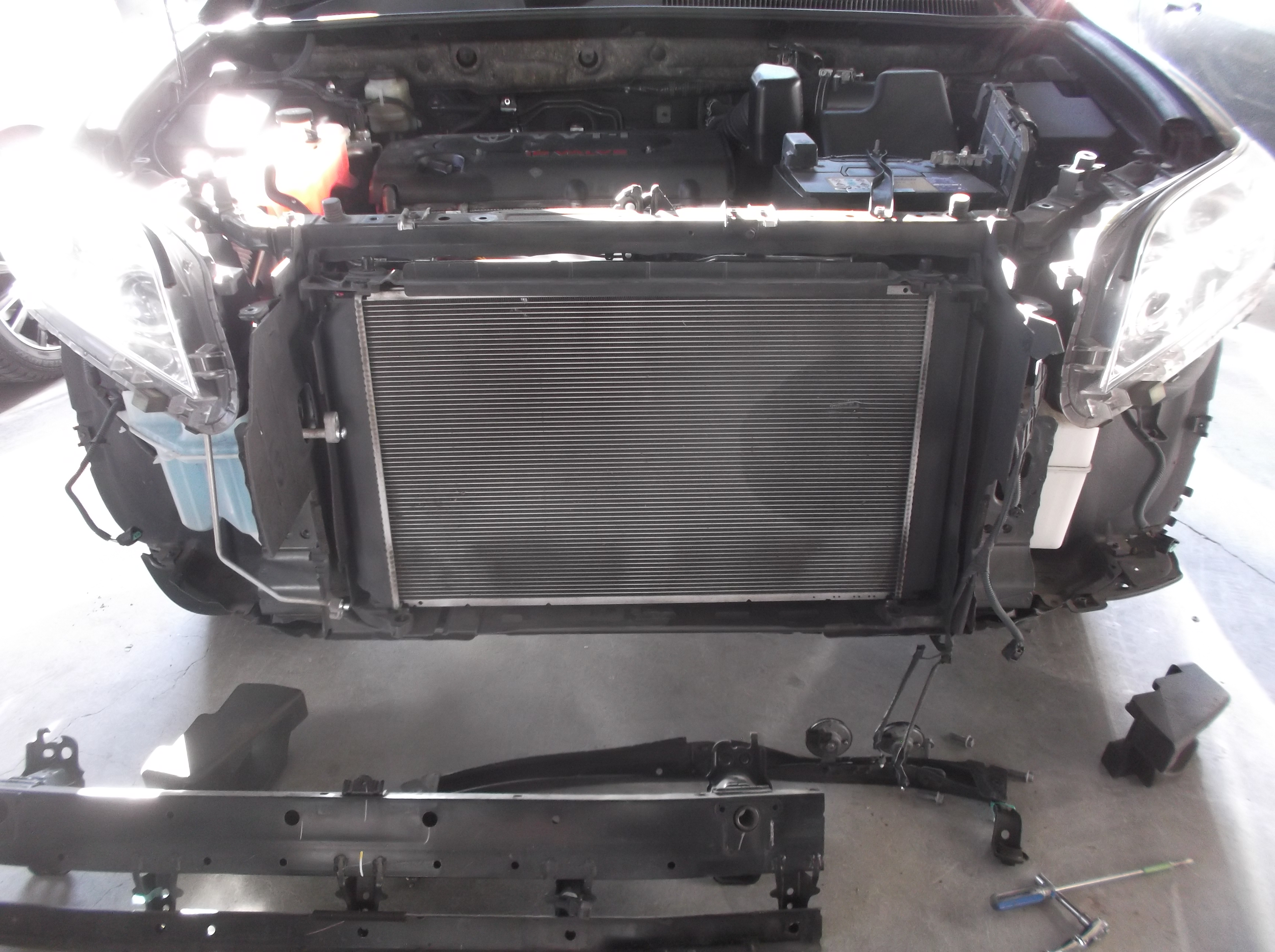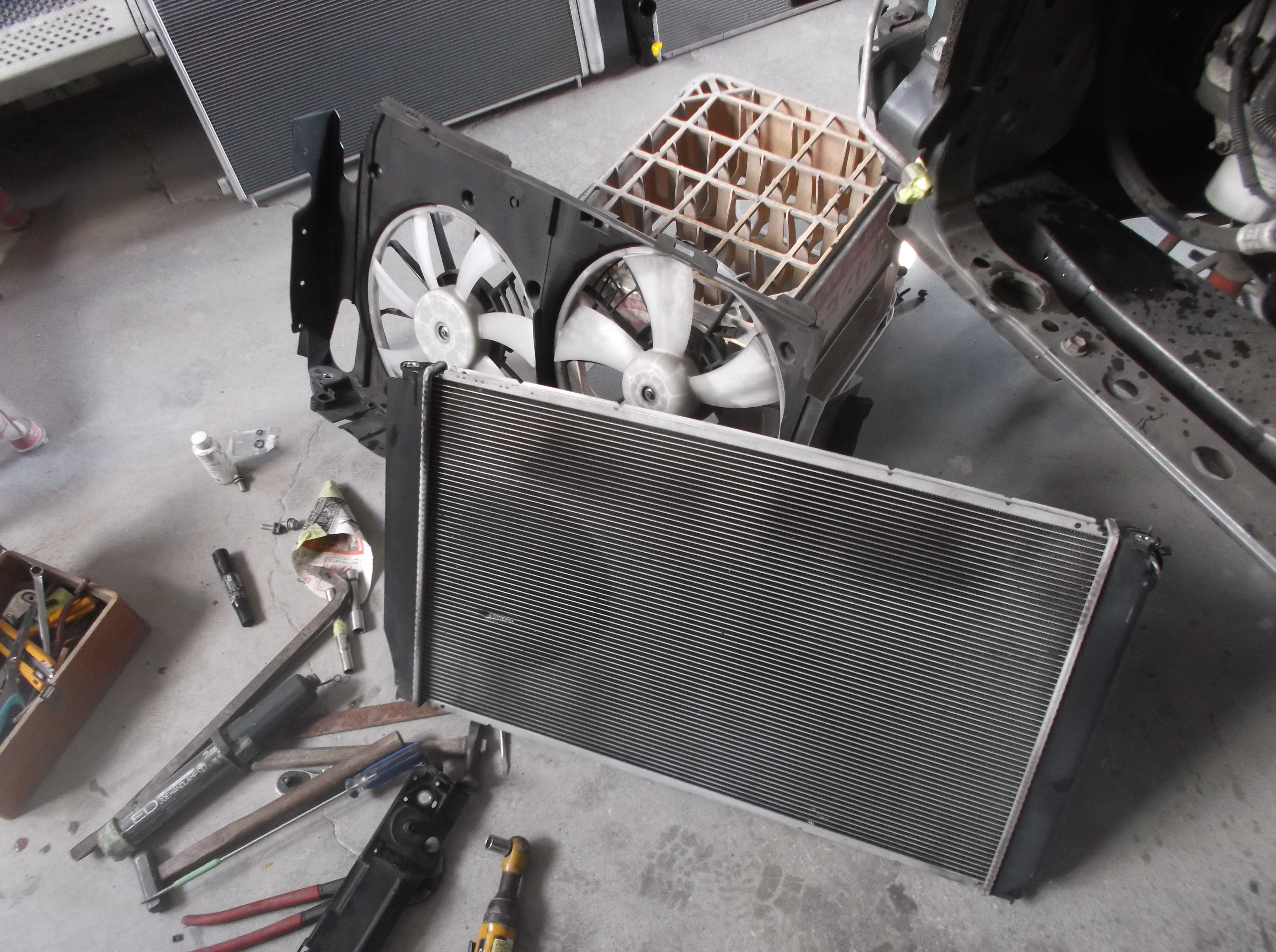 フロント事故で最も怖いのが水漏れやガス漏れ。損傷したラジエーターとコンデンサーを新品へ。エンジンを冷やす機能を真っ先に回復させます。