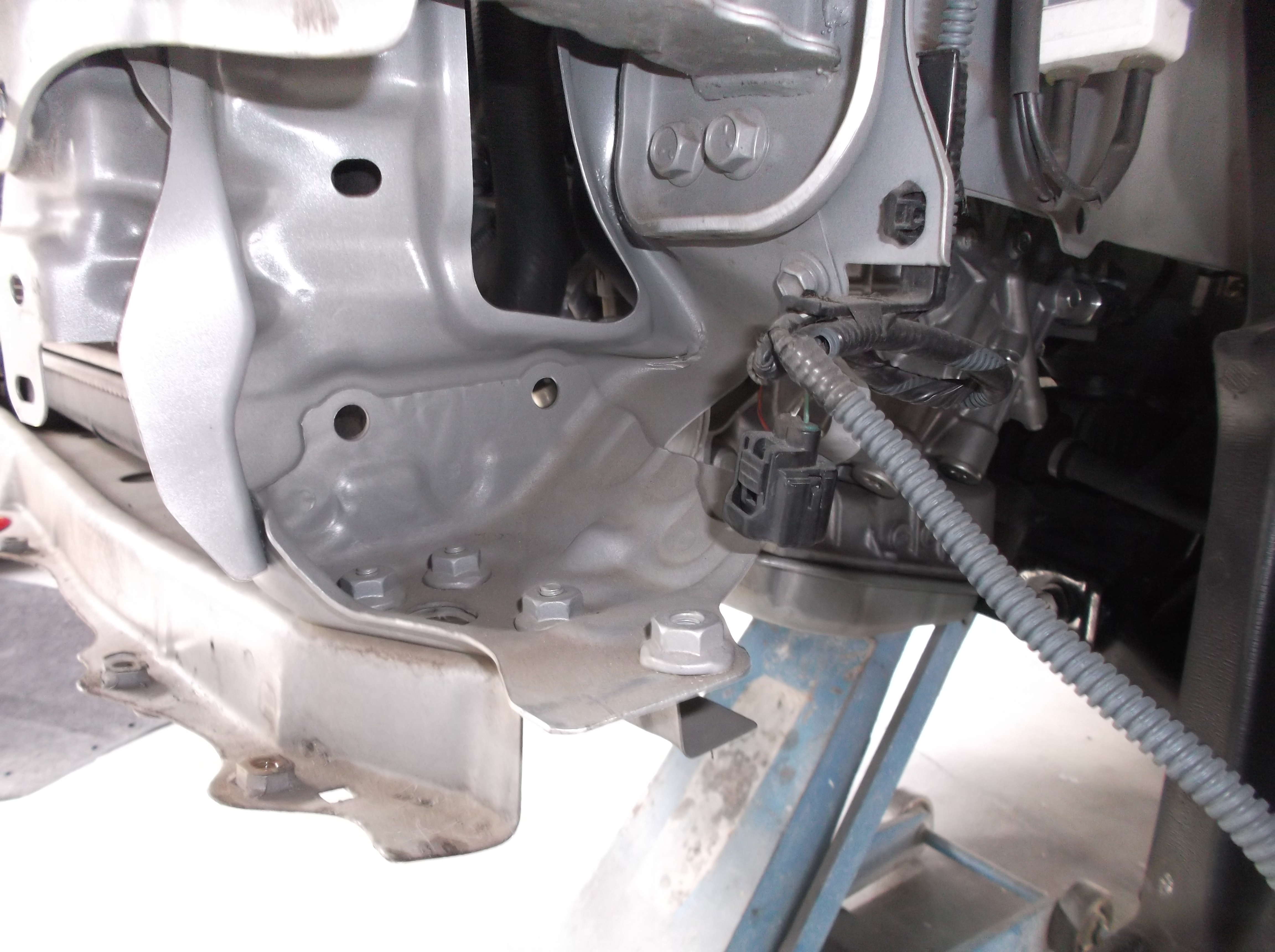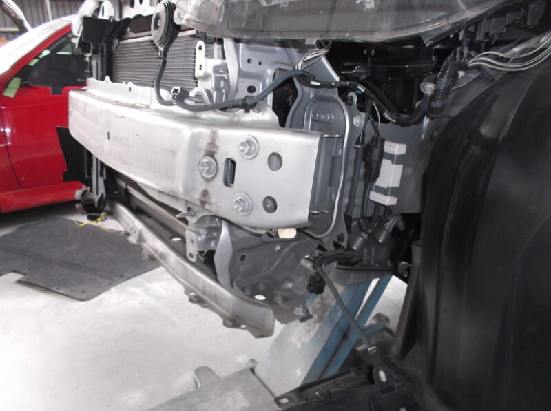 2. 骨格板金(クロスメンバ): 歪んだメンバやラジエータサポートを、フレーム修正機を使い正確な位置へ。