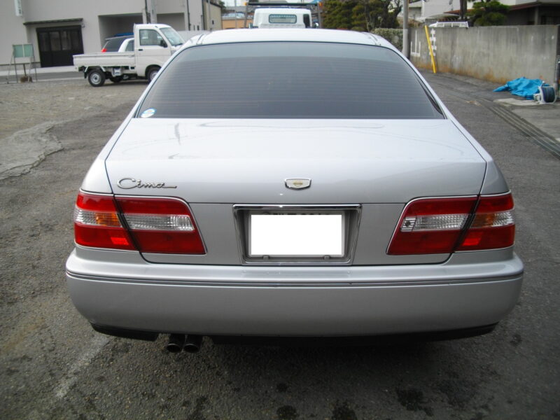 ニッサン・シーマの追突事故修理。トランクリッド交換とリヤメンバー骨格鈑金で、走行安全性と高級車の美観を復元しました。