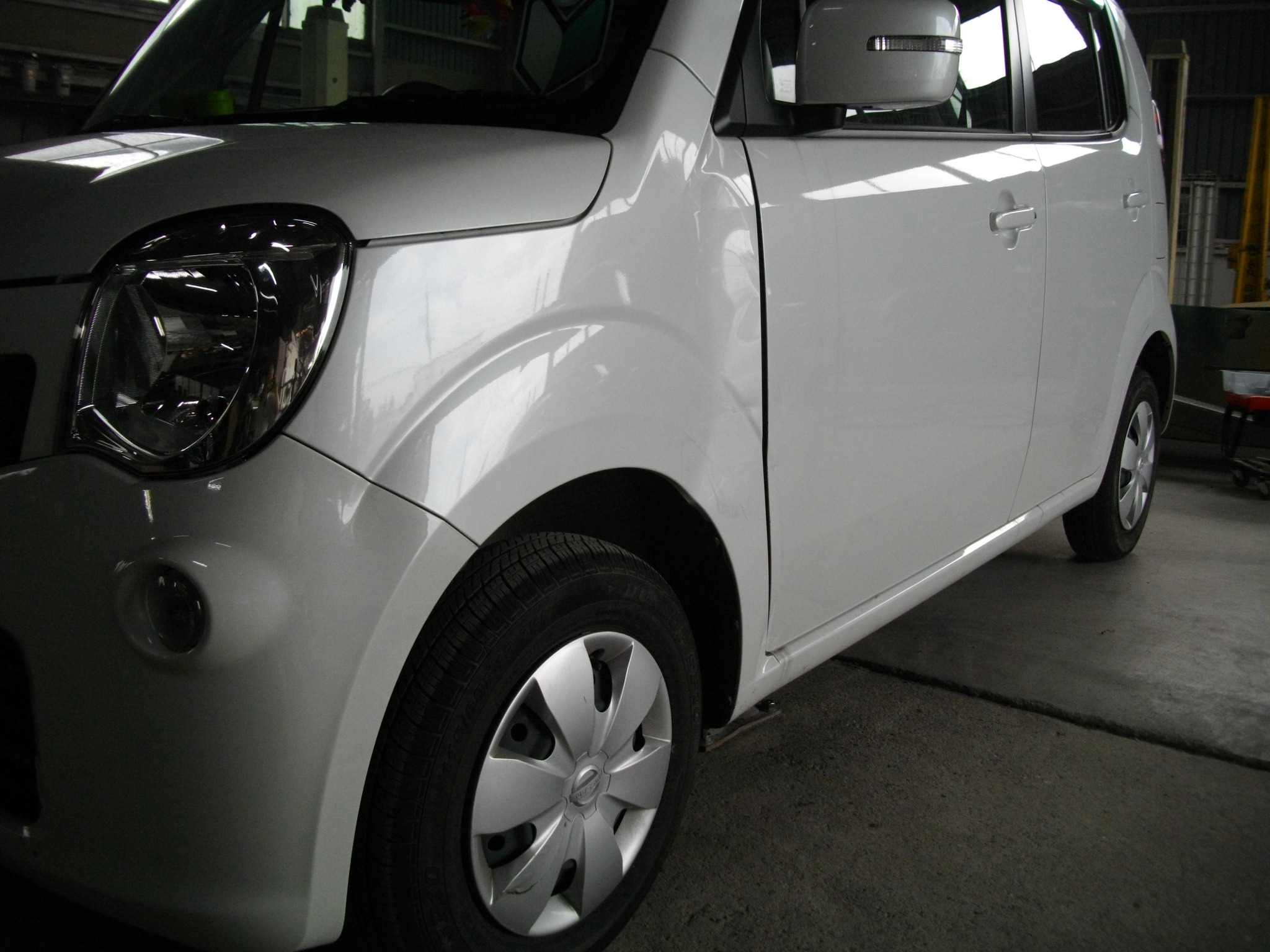 ニッサン モコの板金塗装、フェンダー交換、ドア板金、2K塗装など。自社塗装ブース完備・経験豊富な職人常駐・保険修理対応。地元密着40年の信頼と実績。