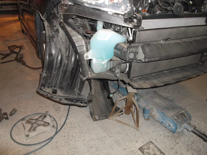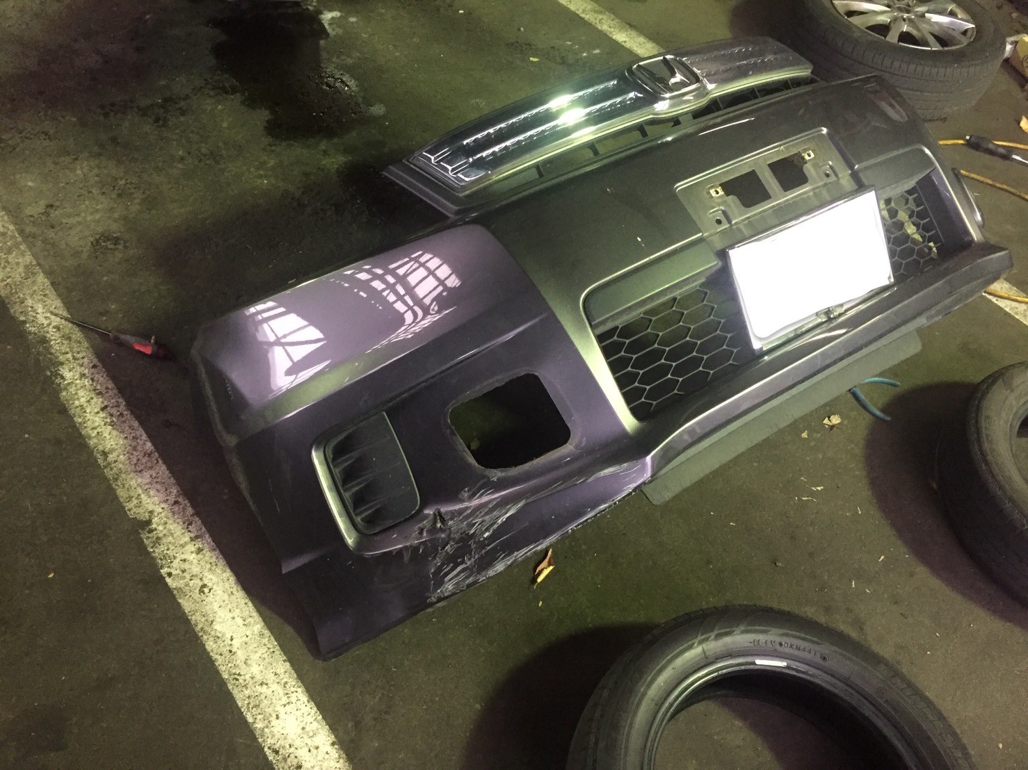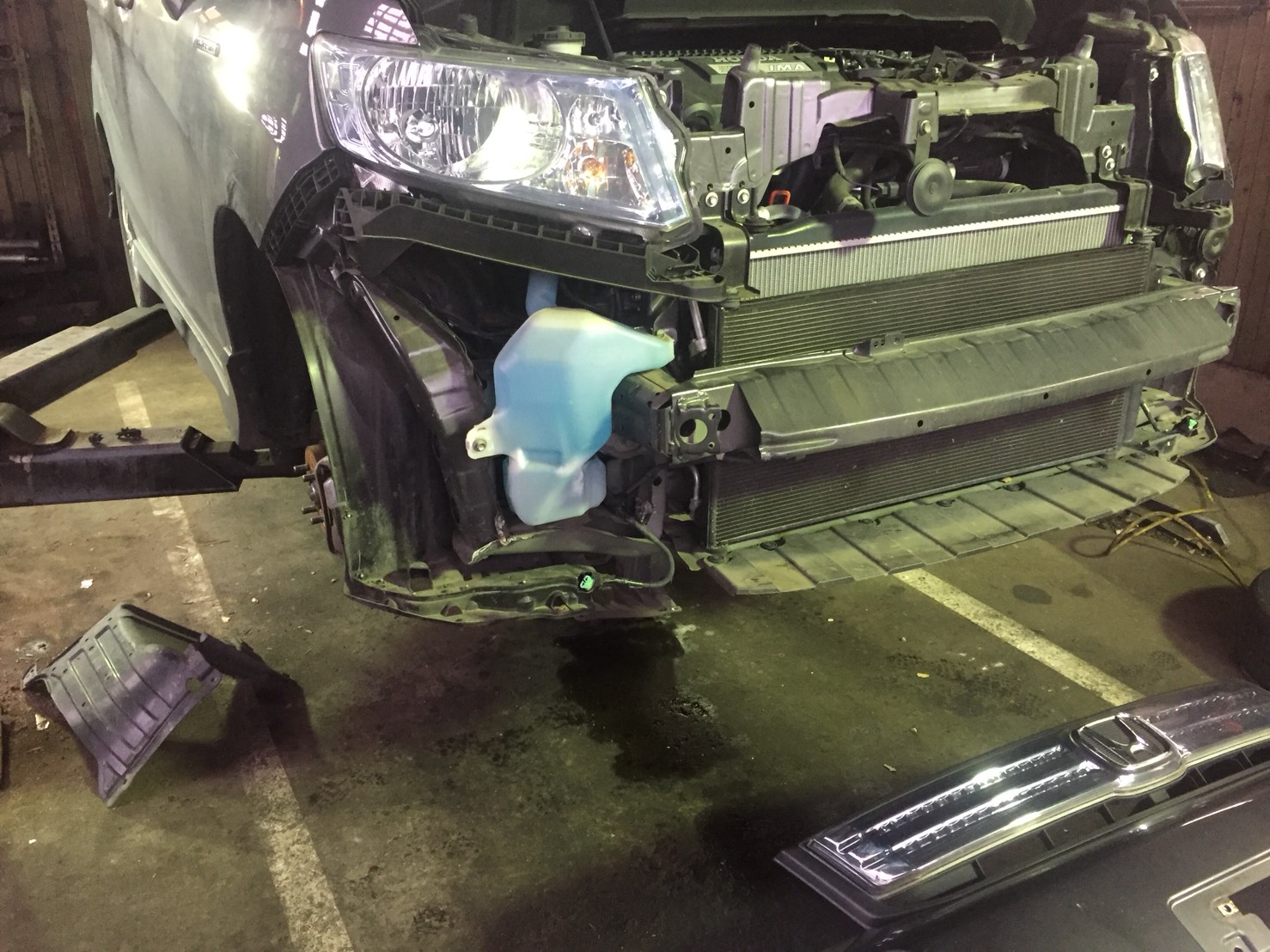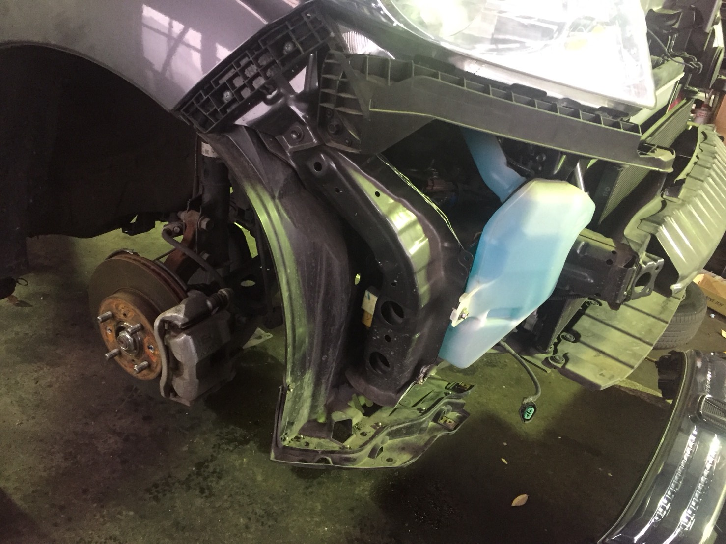 ホンダ フリードスパイクのフロント事故修理。バンパーやウォッシャータンク等の交換に加え、内部の右フェンダーエプロンを板金しました。