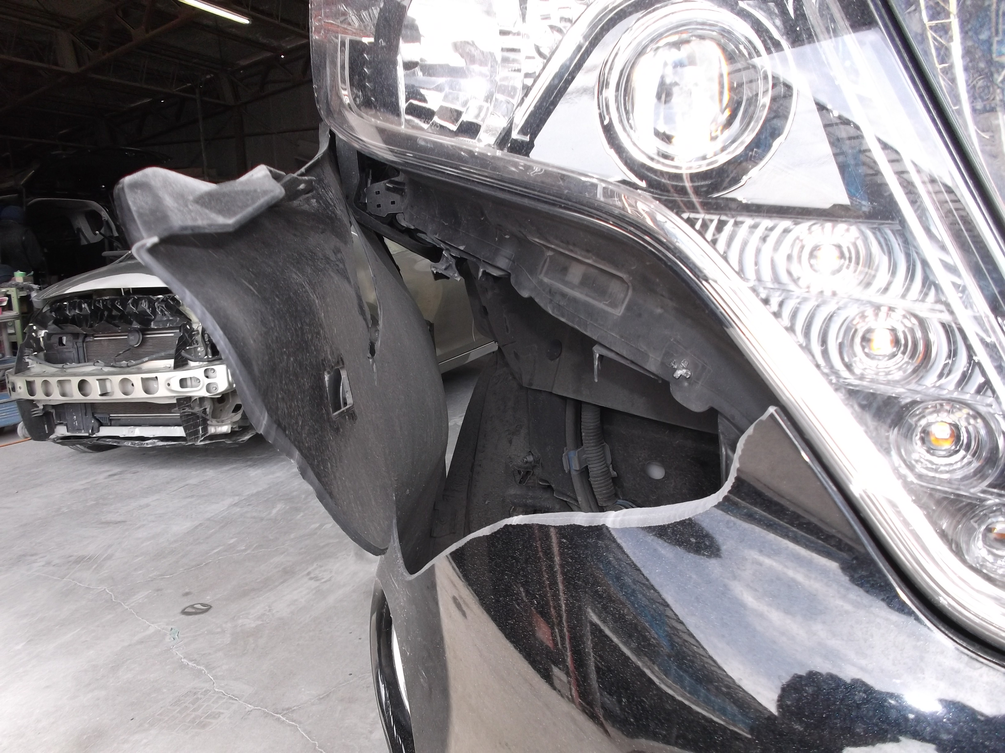 自走不能な状態だったため、まずレッカー車で車両をお預かりしました。保険修理として受付を行い、フロントバンパーやフェンダーなど外装の損傷だけでなく、内部のラジエータサポート(骨格)やフロント足回り一式にまで及ぶ深刻な損傷を詳細に診断しました。