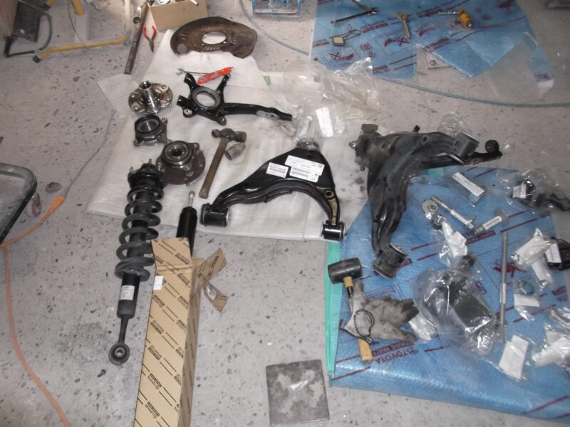 - 足回り一式交換: ショックアブソーバ、ステアリングナックル、アッパー/ロワーアーム、タイヤ・ホイールなど、右フロント足回り部品を全て交換。
