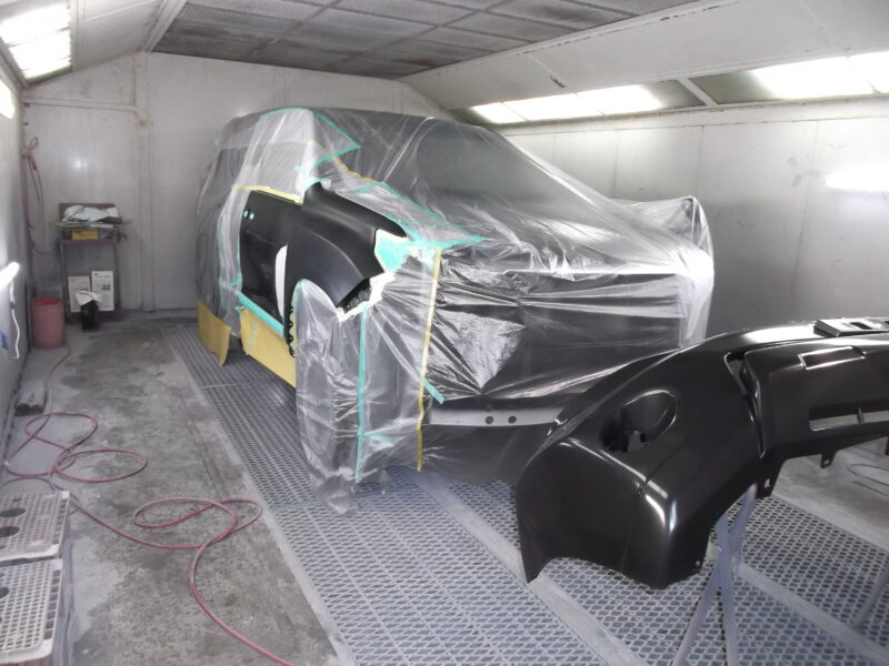 新品のサスペンションアームやナックル、タイヤ・ホイールなどを組み付け、まず機能部品を復元します。外装パネルについては、右フロントドアを鈑金修理し、新品のフロントバンパーや右フロントフェンダーなどを、耐スリ傷高機能塗装を含む2コートパールで丁寧に塗装しました。