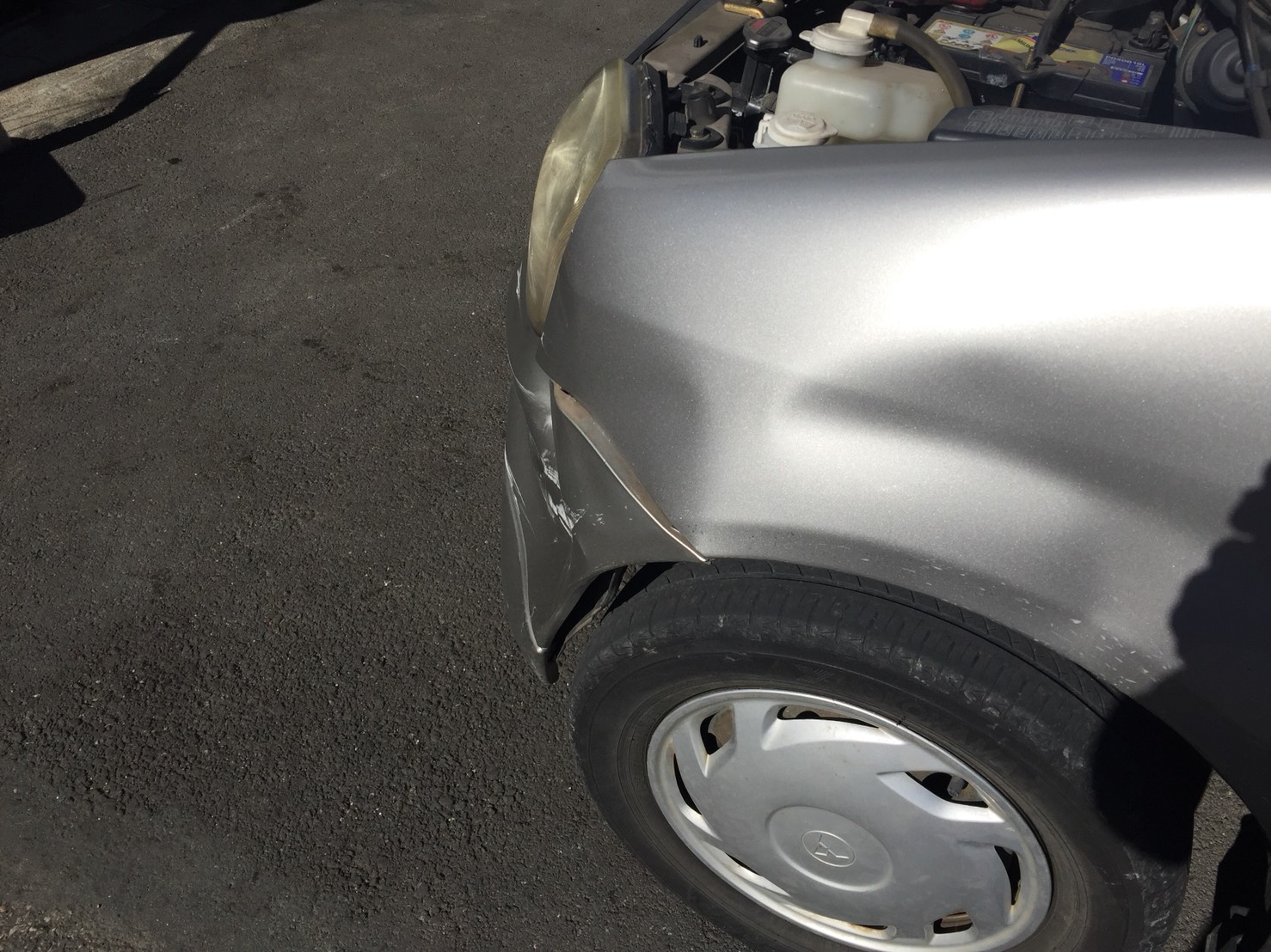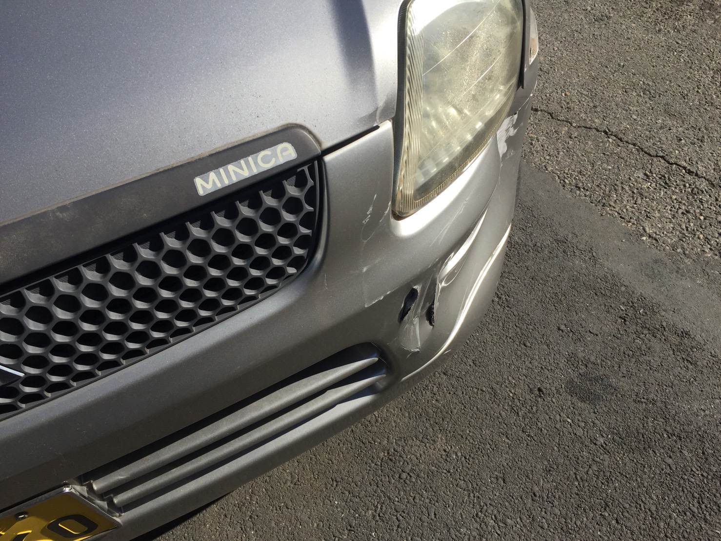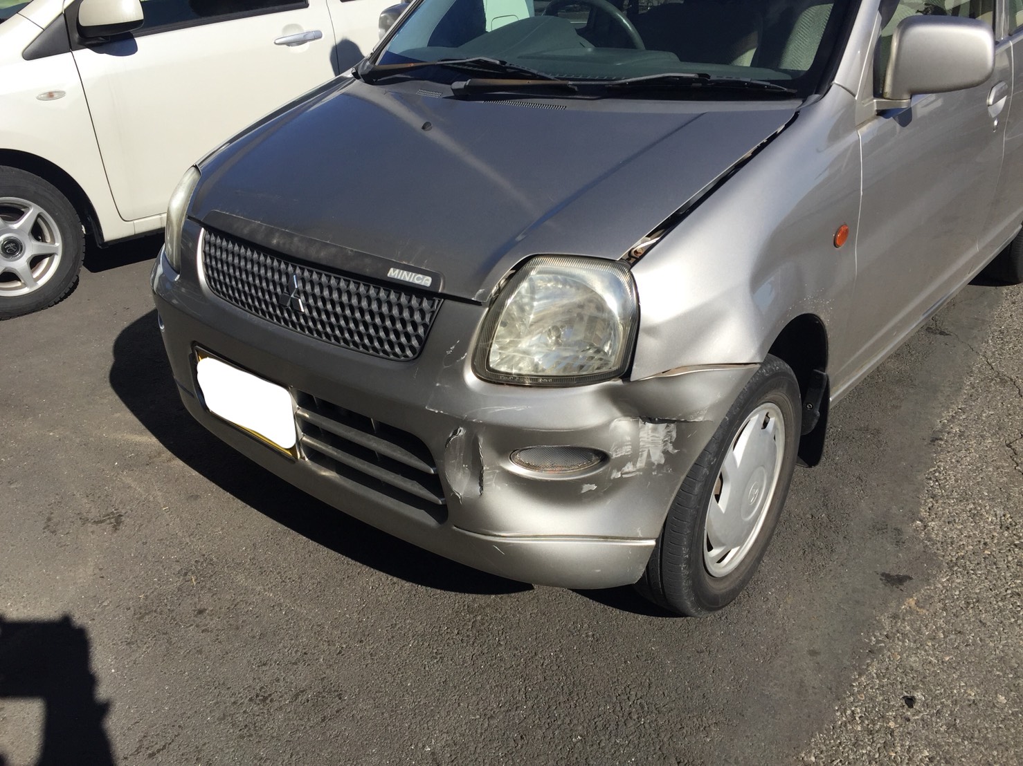 ミニカのフロント事故修理|大きなへこみもパーツ交換と板金で元通り。