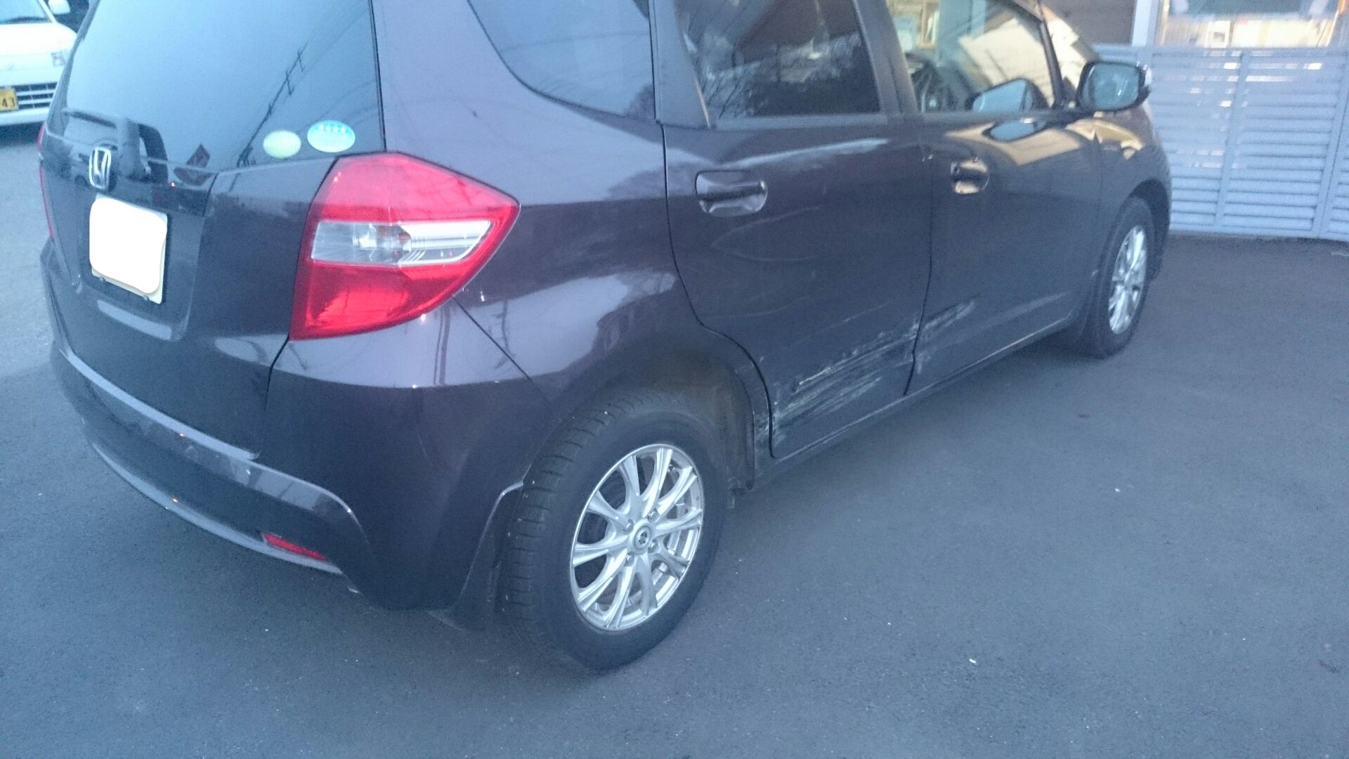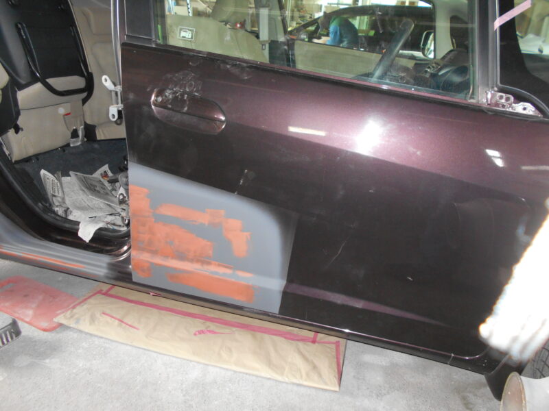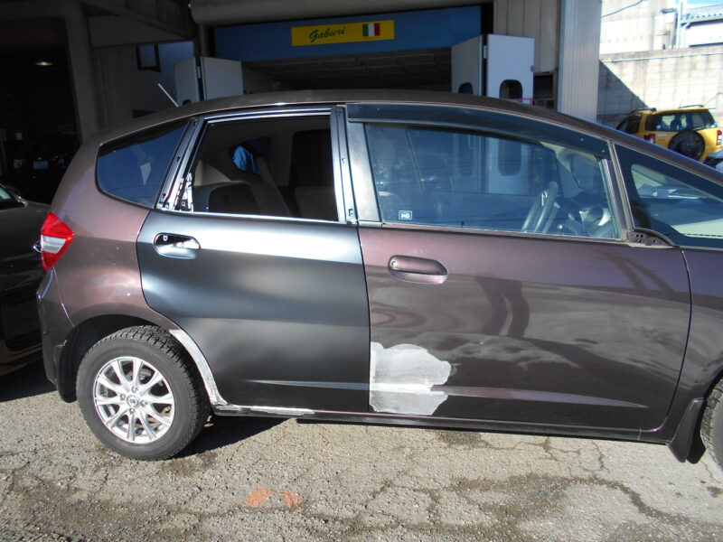 【伊勢崎市】ホンダ フィットの右リヤドア・サイドシル交換を含むキズ・へこみの広範囲な鈑金塗装事例!