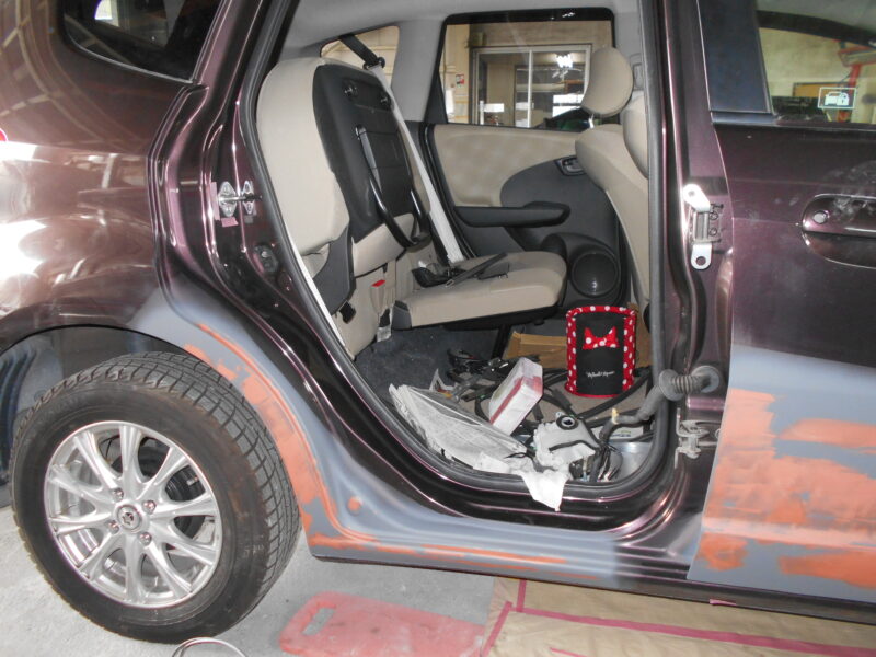 伊勢崎市よりご相談いただいた損傷の状況を、まず正確に把握します。今回はドアやフェンダーだけでなく、車体の土台であるサイドシルまで歪みが生じていました。お客様と相談し、リヤドアの交換と、サイドシルの修正・交換を含む修理計画を立てました。