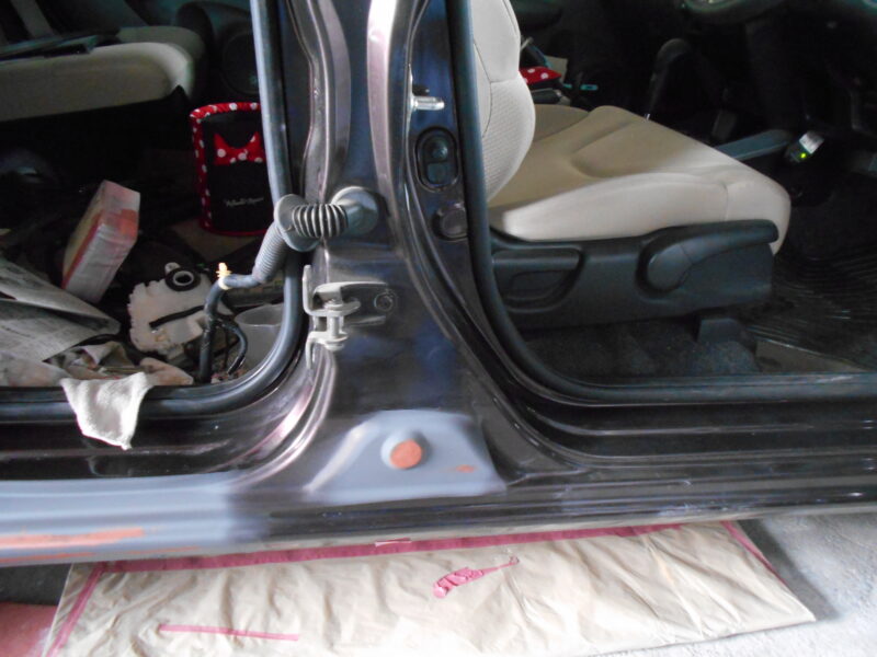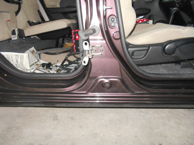 ホンダ・フィット右側面の重度事故修理。リヤドア交換と、サイドシル・ホイールハウスを含む車体骨格の修正により、安全性を完璧に復元。