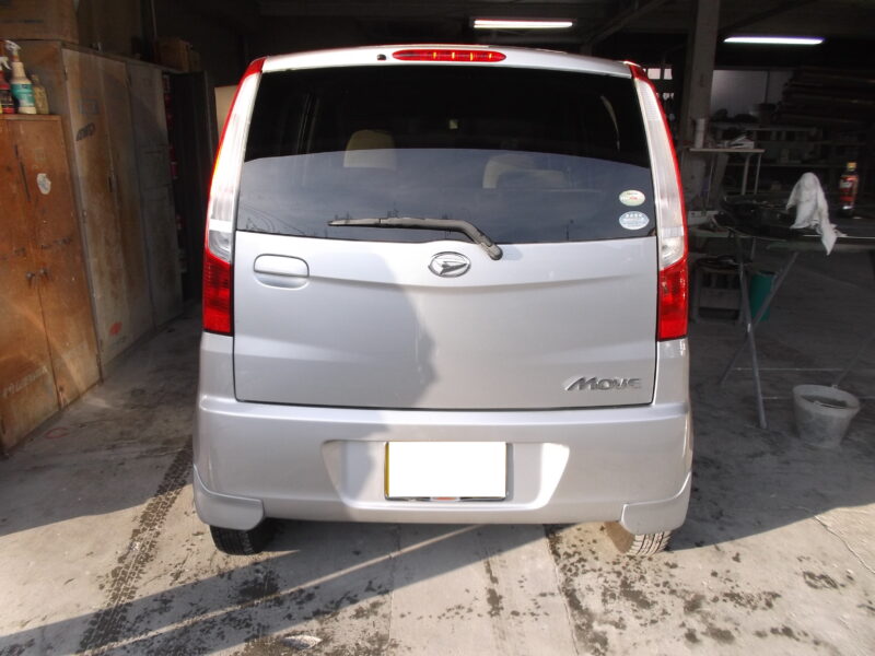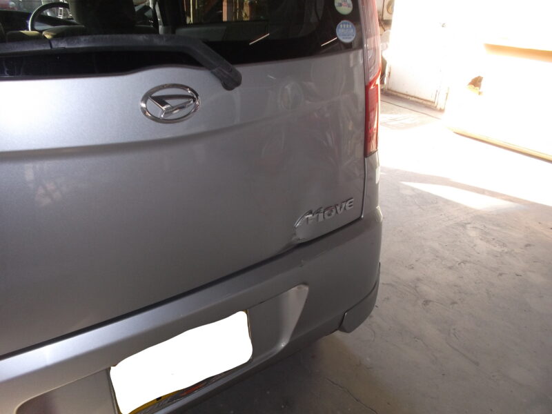 ムーヴの追突事故修理(保険適用)。バックドア交換に加え、ロワバックパネルの骨格修正で、安全に復元しました。
