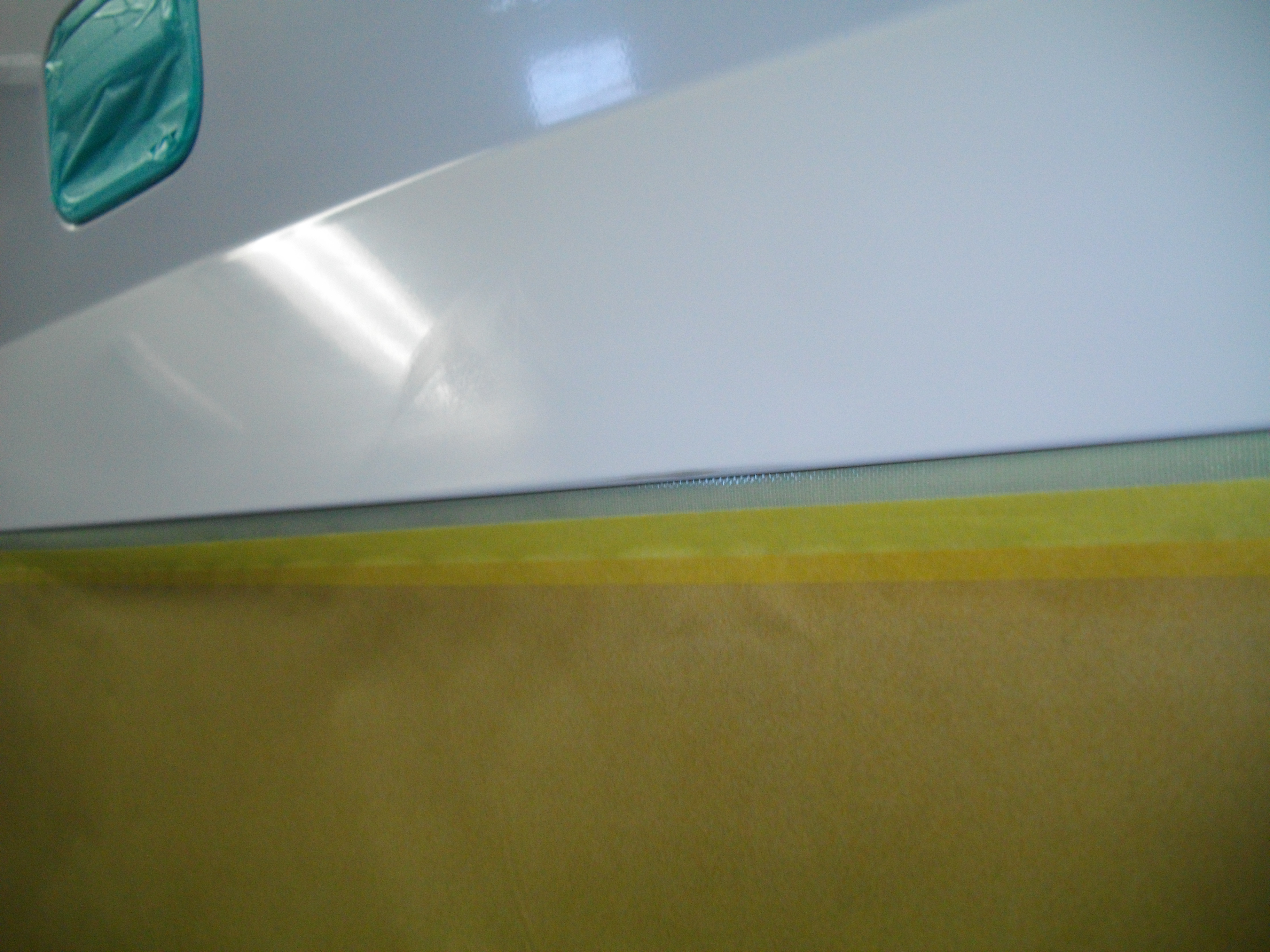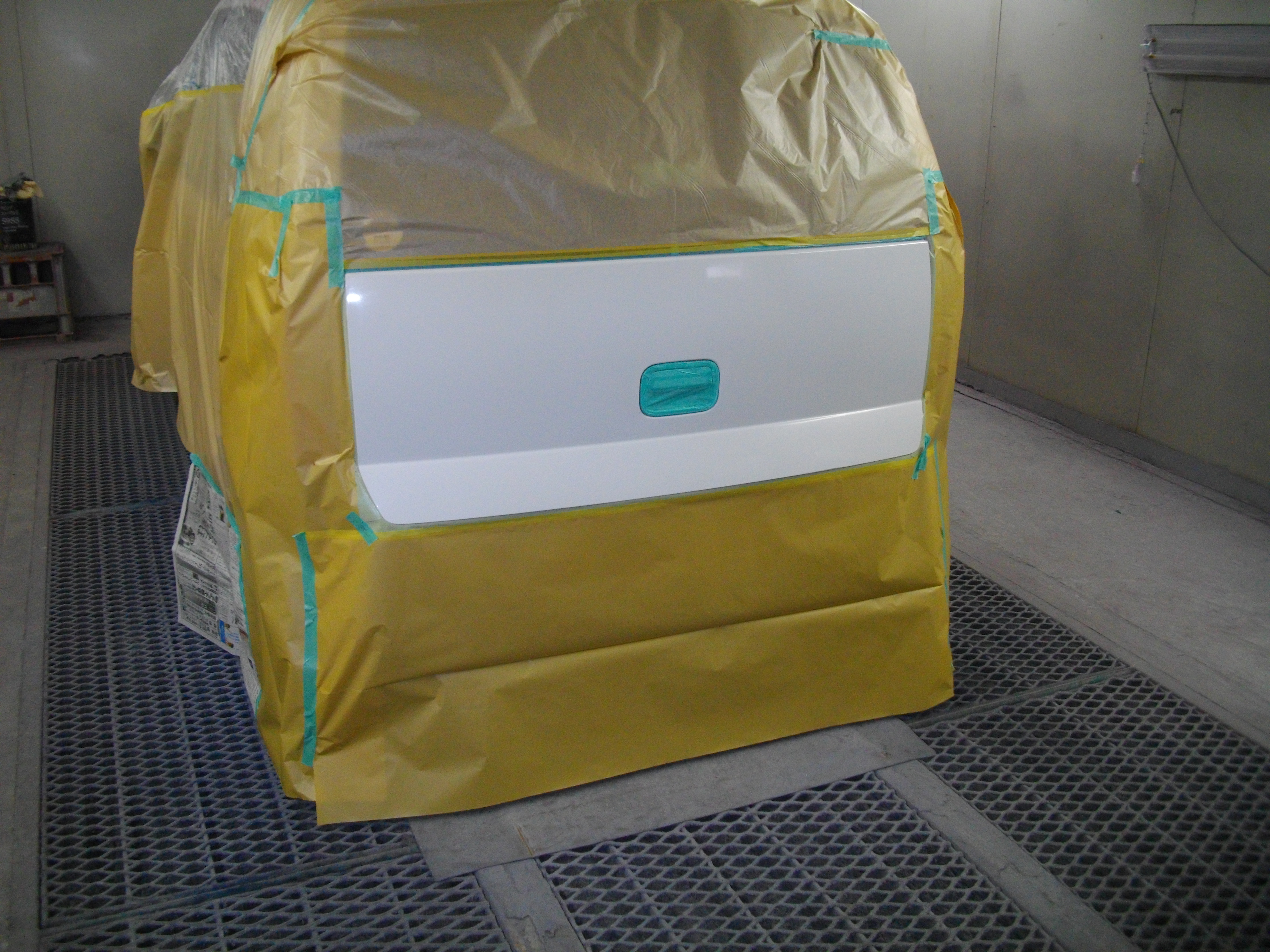 交換しないバックドアのへこみやキズを、熟練の職人が叩き出し、パテで整形。その後、塗装の密着性を高める下地処理(サフェーサー)を行い、修理跡が外から一切見えない状態にします。