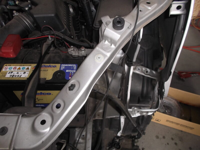 損傷箇所に応じて、フロントバンパー、サイドサポート、ヘッドランプユニット、フェンダーエプロンなどを安全に脱着。エンジンルーム内の配線や配管も丁寧に取り外し、作業の安全性と正確性を確保します。