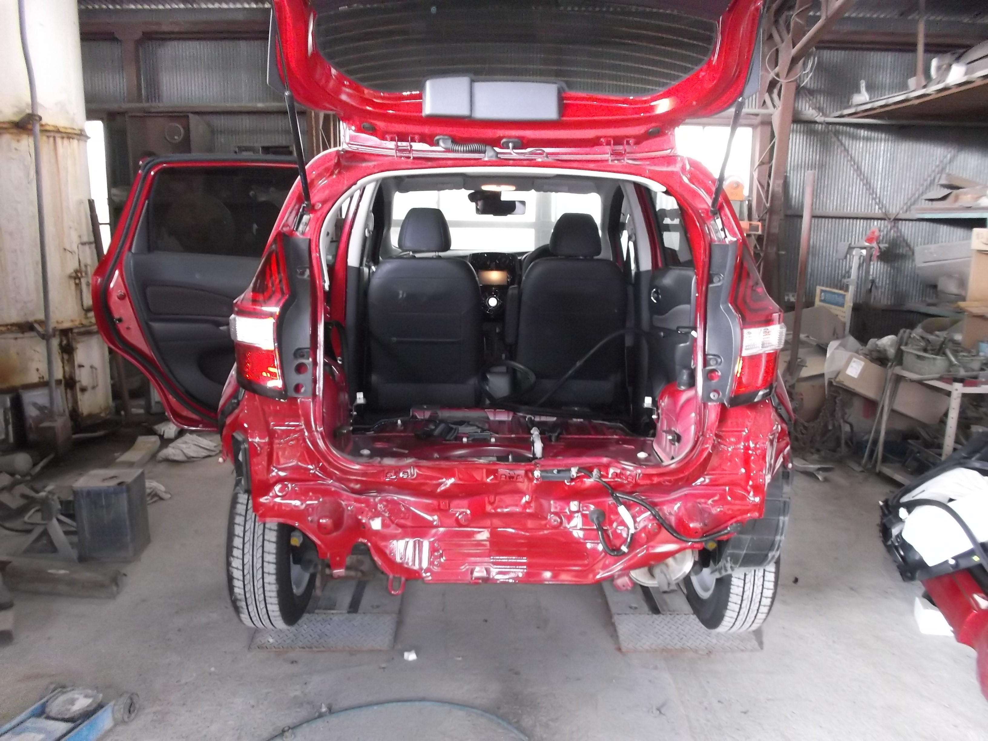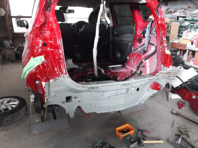 この事故修理で最も難しかったのは、左右のクォーターパネル鈑金に加え、内部のサイドリヤメンバやバックピラーレインフォースメントといったフレーム骨格の歪みを正確に戻すことでした。これらのフレーム修正を怠ると、ノートの安全性と剛性が損なわれます。