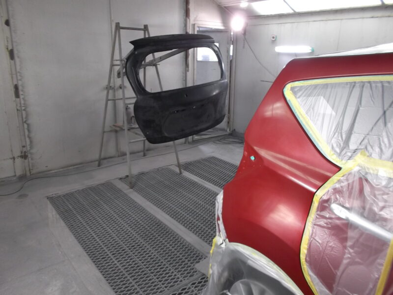 骨格修正後、左右のクォーターパネルのへこみ修理を鈑金で修正。また、交換するバックドア、リヤアッパパネル、リヤバンパーなどの新品部品を塗装ブースへ運び、塗装前の下地処理を施します。