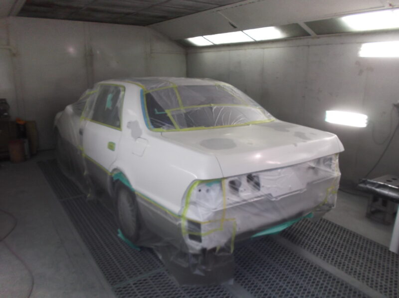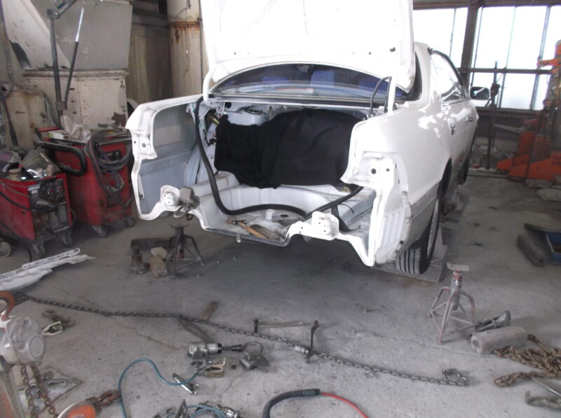 バンパーやランプを取り外し、修理対象のクォーターパネルやフロアサイドメンバーの凹みを修正。必要に応じてトランクパネルも中古部品に交換し、形状を整えます。