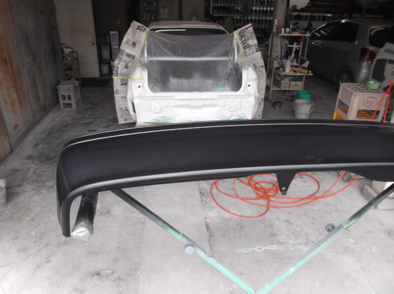 お車を確認したところ、リヤバンパーは深い損傷で板金修理では強度や見た目に不安が残る状態でした。そこで、状態の良い中古部品を活用して交換することが最適と判断しました。