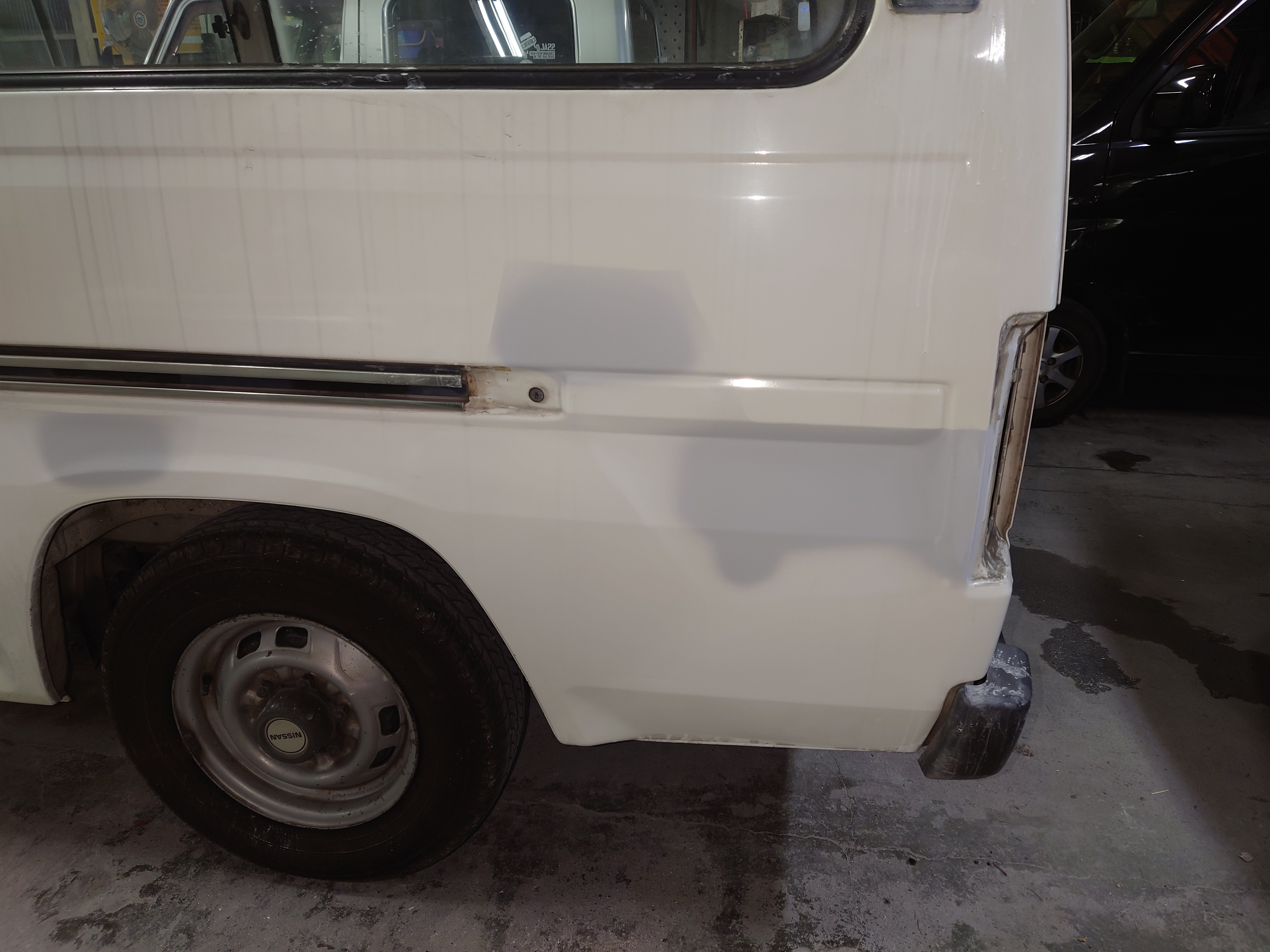 今回は、桐生市のお客様より日産キャラバンの左リアフェンダーのキズ修理をご依頼いただきました。