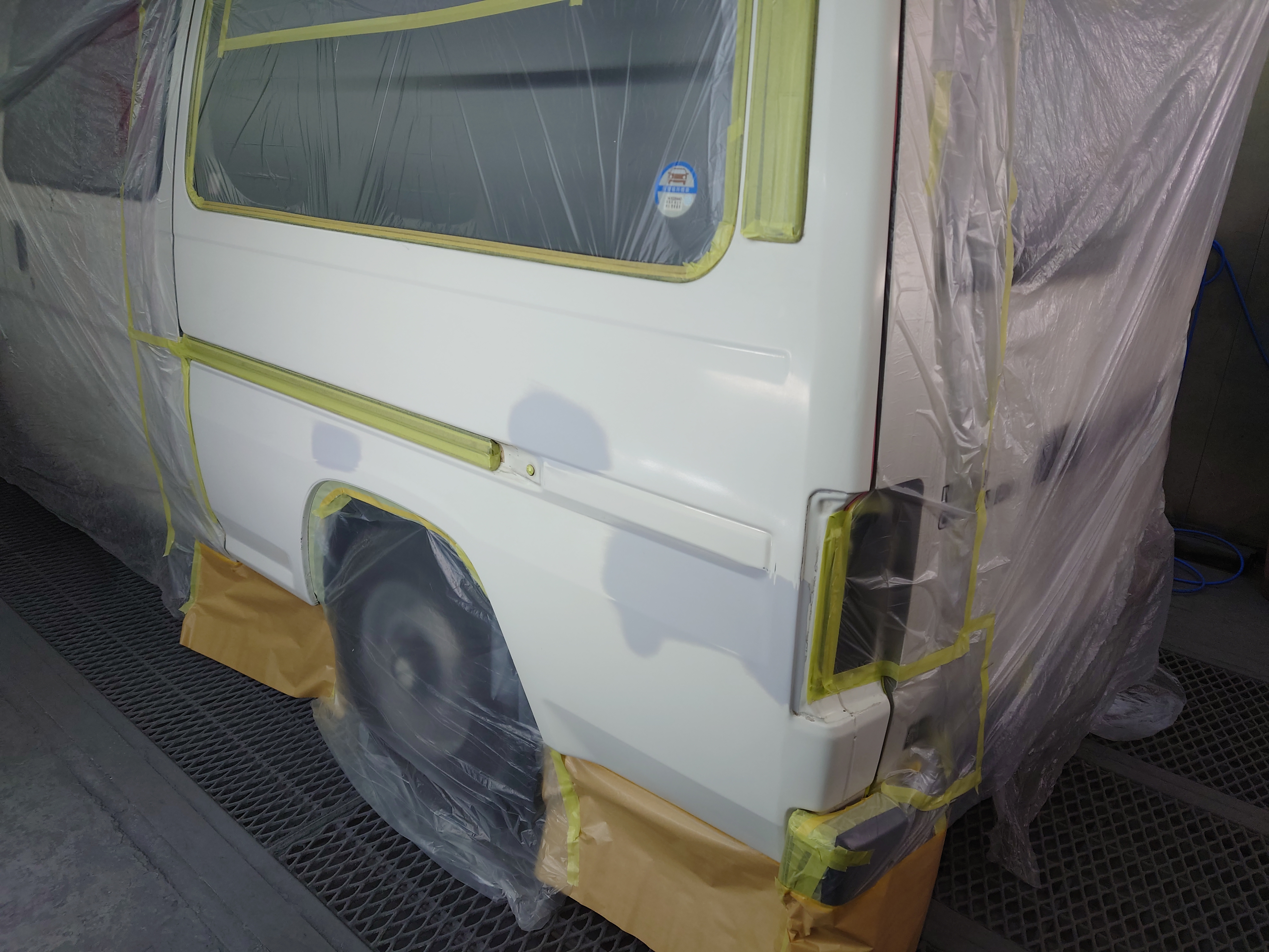 今回の施工では、左リアフェンダー板金・2K塗料による2コートソリッド塗装を実施しました。