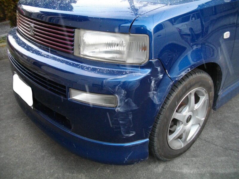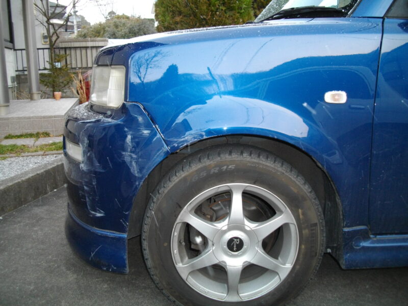トヨタ・bBの左フロントバンパー、フェンダー、ホイールに生じたキズを修理で対応。板金補修と塗装により、美しさと安全性を両立した仕上がりを実現しました。