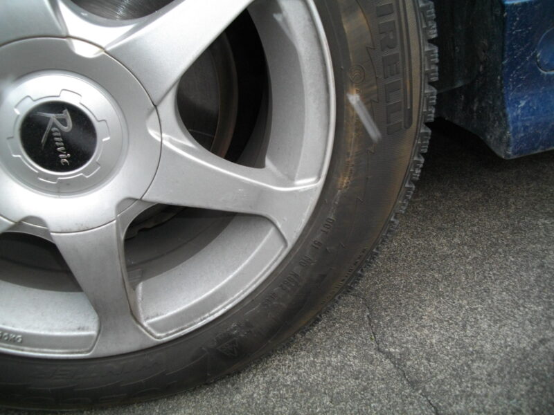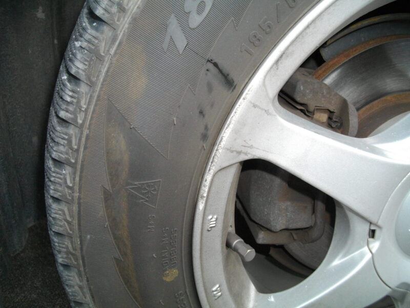 左フロントバンパーとフェンダーには目立つキズ、さらにタイヤとホイールにも擦り傷が…。