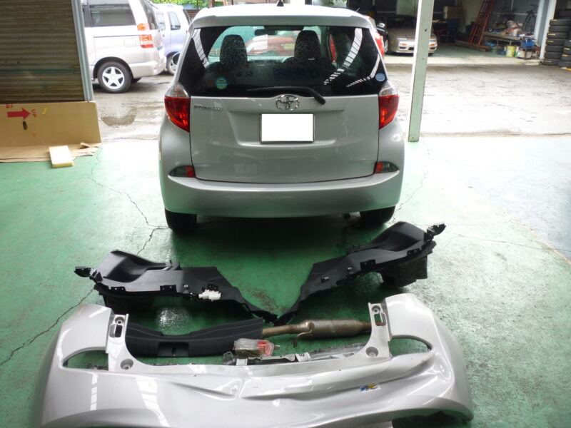トヨタラクティスのリヤバンパー、左右リヤバンパリテーナアッパ・ピース、バックドアパネルサブAssy、バックドアダンパー、バックウインドウガラス・モール、バックドアロックなどを交換・修理。