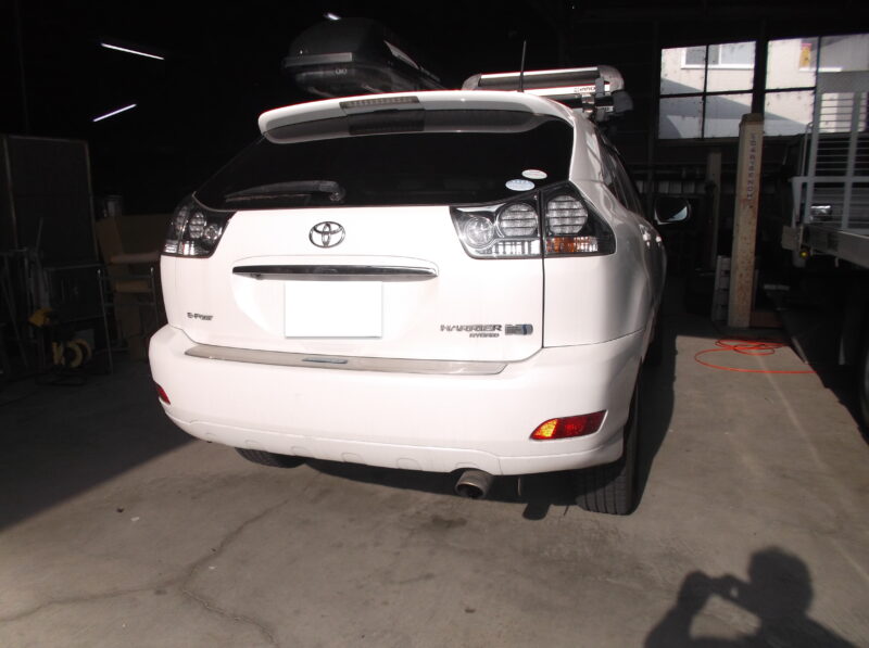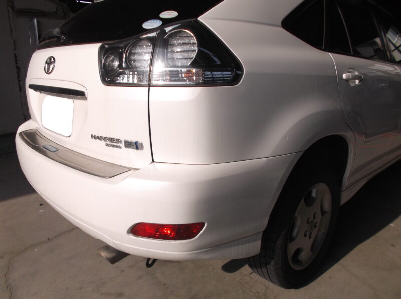 トヨタ・ハリアーのリヤバンパーを脱着し、板金塗装と部品交換を行いました。3コートパールで違和感のない仕上がりとなり、お客様にも大変ご満足いただけました。