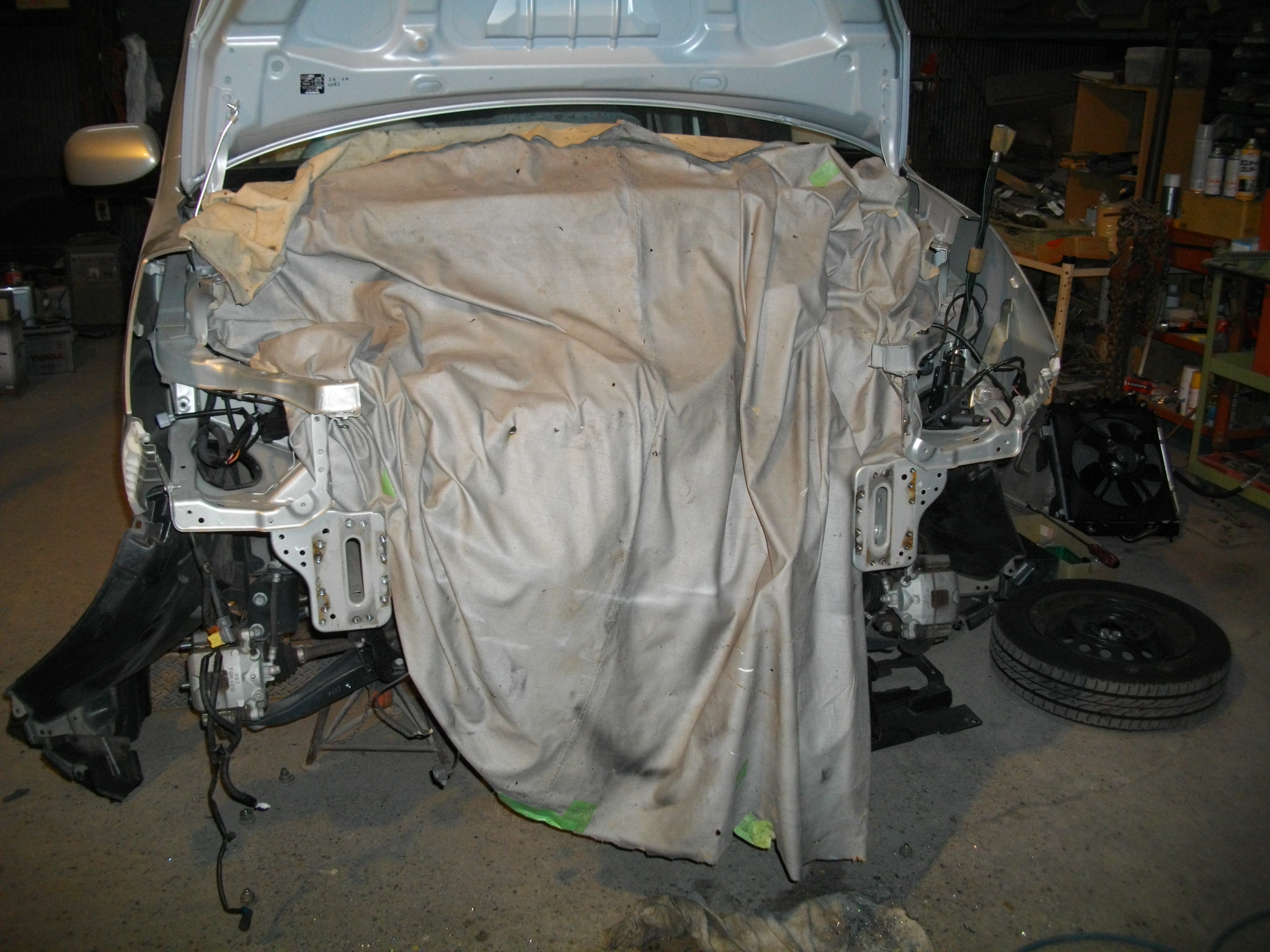 スバル・ステラのフロント修理。コアサポート(骨格)交換、エンジンルーム配線脱着を含む修理でした。