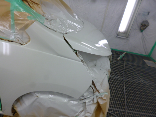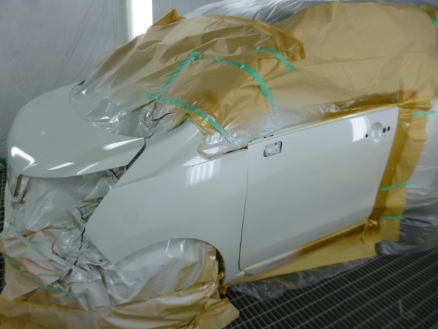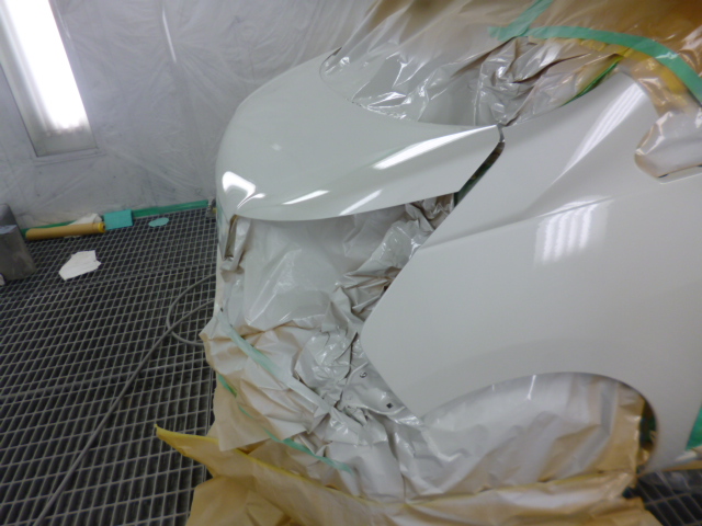 交換・修正した部品に対し、塗装工程に入ります。ステラのボディカラーは非常に難易度の高い3コートパールのため、熟練の技術で元の色と完全に一致するよう調色。塗装ブース内で、交換部品やフェンダーにムラなく厚みのある美しい塗装を施し、鈑金塗装の仕上がりを最高品質に引き上げます。