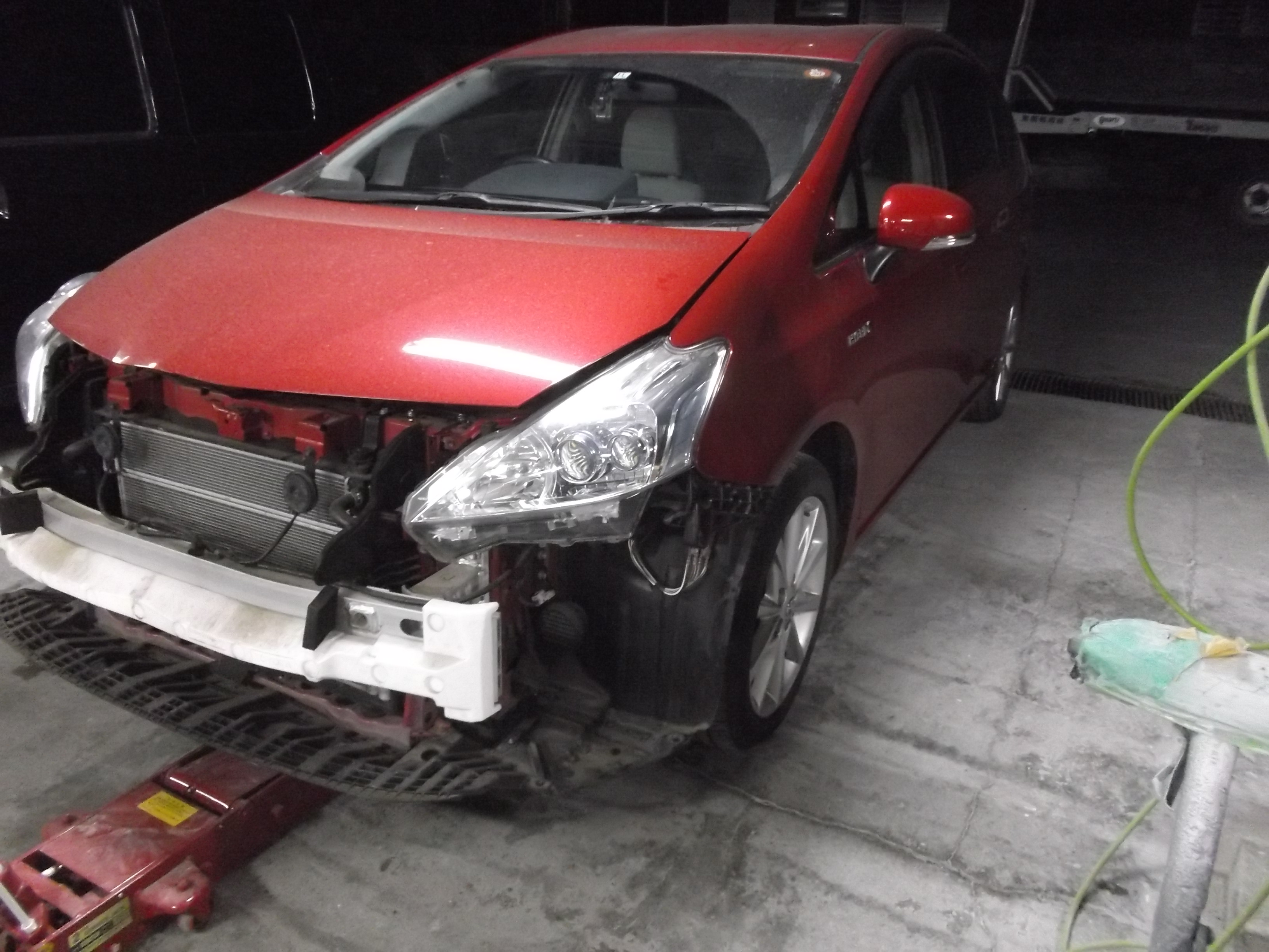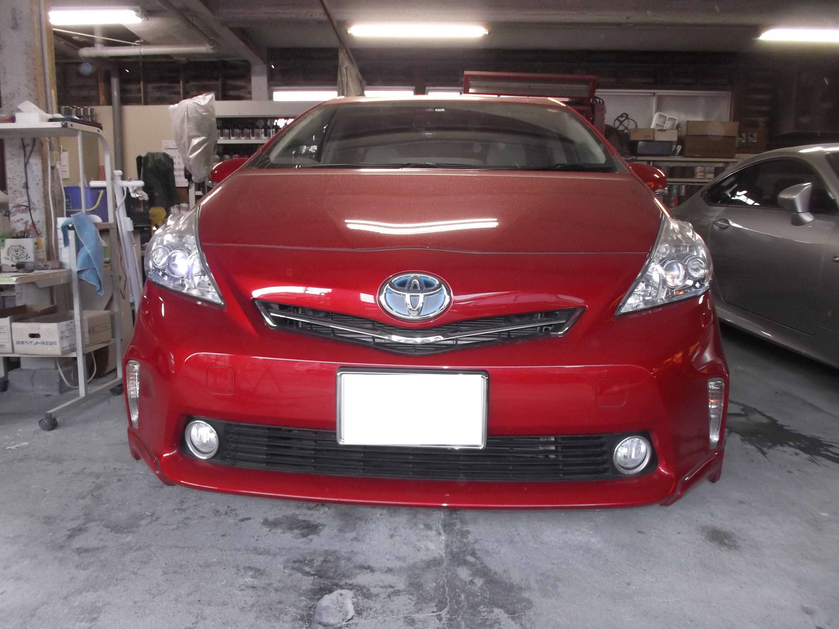 太田市のお客様のプリウスαは、フロントバンパーの脱着・修理、ラジエーターグリル・ロワの脱着、左右フロントスポイラーカバー脱着、ヘッドランプウォッシャーアクチュエーターやフォグランプ脱着、左フロントフェンダーの板金修理、サイドパネルのエンブレム取替、そして2K・2コートパール塗装を行いました。小さなキズからパネル全体の仕上がりまで丁寧に施工し、元の美しい光沢と色味を再現しています。