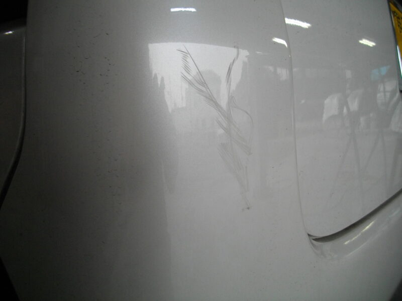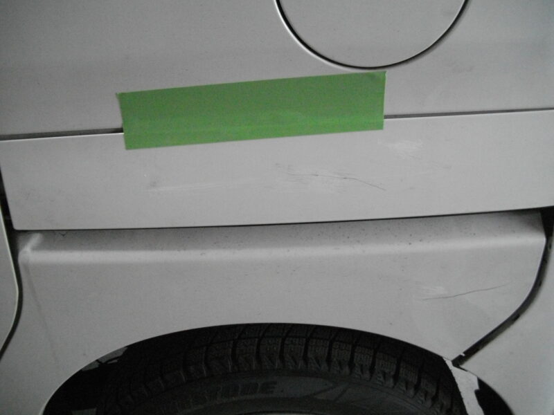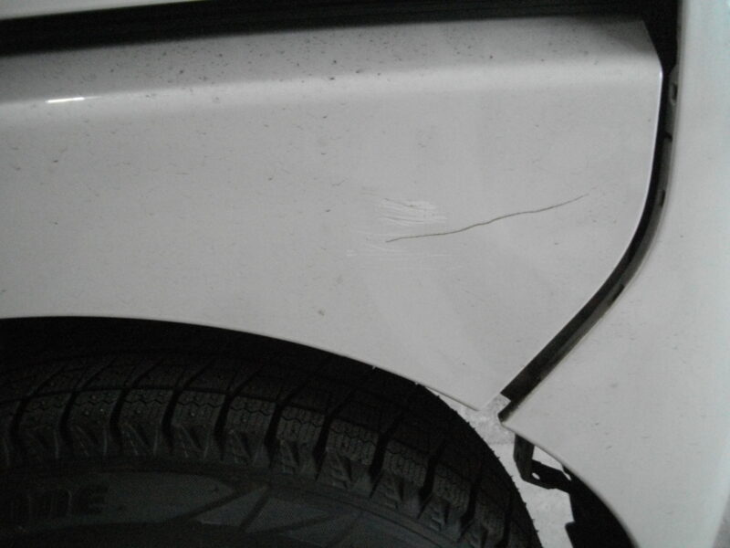 クォータパネルの凹みや歪みを修正し、リヤバンパーの損傷部も整形。