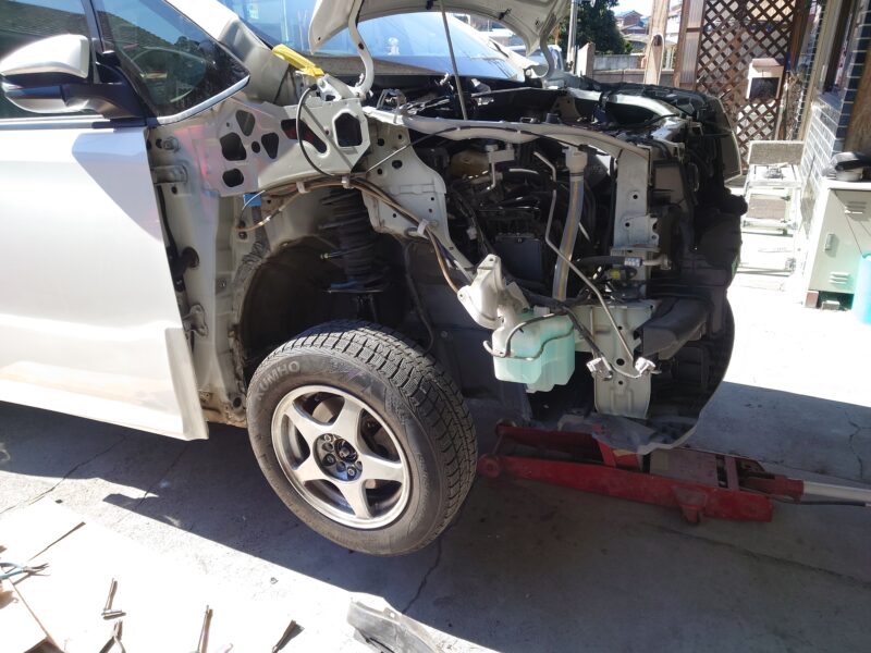 損傷が大きかったフロントバンパーや右フロントフェンダー、ロワーアーム、ステアリングナックルなど必要な部品を丁寧に取り外し、新品または高品質リサイクルパーツに交換しました。