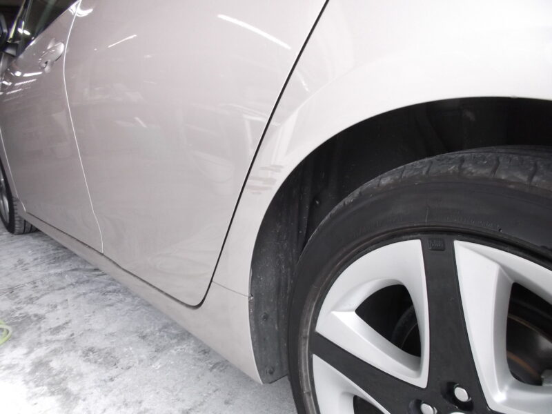 クォーターパネルも同様に板金で修復し、2K塗料・メタリック塗装で隣接パネルと自然に馴染む色味に調整。さらにクォーツガラスボディーコートで部分施工を行い、艶と保護性も向上させました。