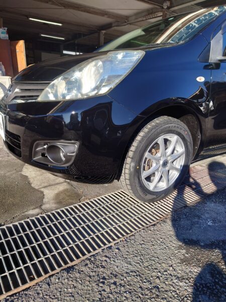 日産ノートのフロントバンパー・ラジエーターグリル・エネルギーアブソーバー・アルミホイール・左右フロントフェンダー・ヘッドランプの修理・交換を実施。
